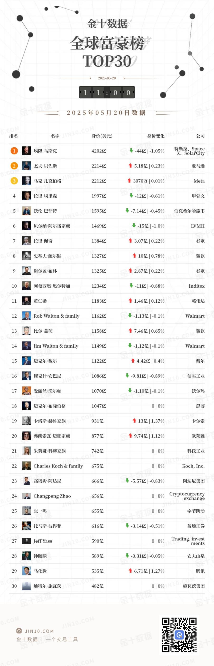 金十图示:2025年05月19日(周一)全球富豪榜 0.com @ JINTO.COM JIHTO.COM 金十数据 | 一个交易工具 n.coM . | 排名 | 名字 | 身价(美元) | 身价变化 | 公司 | | --- | --- | --- | --- | --- | | | 埃隆·马斯克 | 4247亿 | 0 0% | 特斯拉、Spa | | 2 | 马克·扎克伯格 | 2212亿 | 0 0% | Meta | | | 杰夫·贝佐斯 | 2209亿 | 0 0% | 亚马逊 | | 4 | 拉里·埃里森 | 2009亿 | 0 0% | 甲骨文 | | 5 | 沃伦·巴菲特 | -0 1602亿 | 0 0% | 伯克希尔哈撒韦 | | 6 | 贝尔纳·阿尔诺家族 | 1484亿 | 0 0% | LVMH | | 7 | 拉里·佩奇 | 1381亿 | 0 0% | 谷歌 | | 8 | 谢尔盖·布林 | 1322亿 | 0 0% | 谷歌 | | 9 | 史蒂夫·鲍尔默 | 1316亿 | 0 0% | 微软 | | 10 | 阿曼西奥·奥尔特加 | 1245亿 | 0 0% | Ind ...