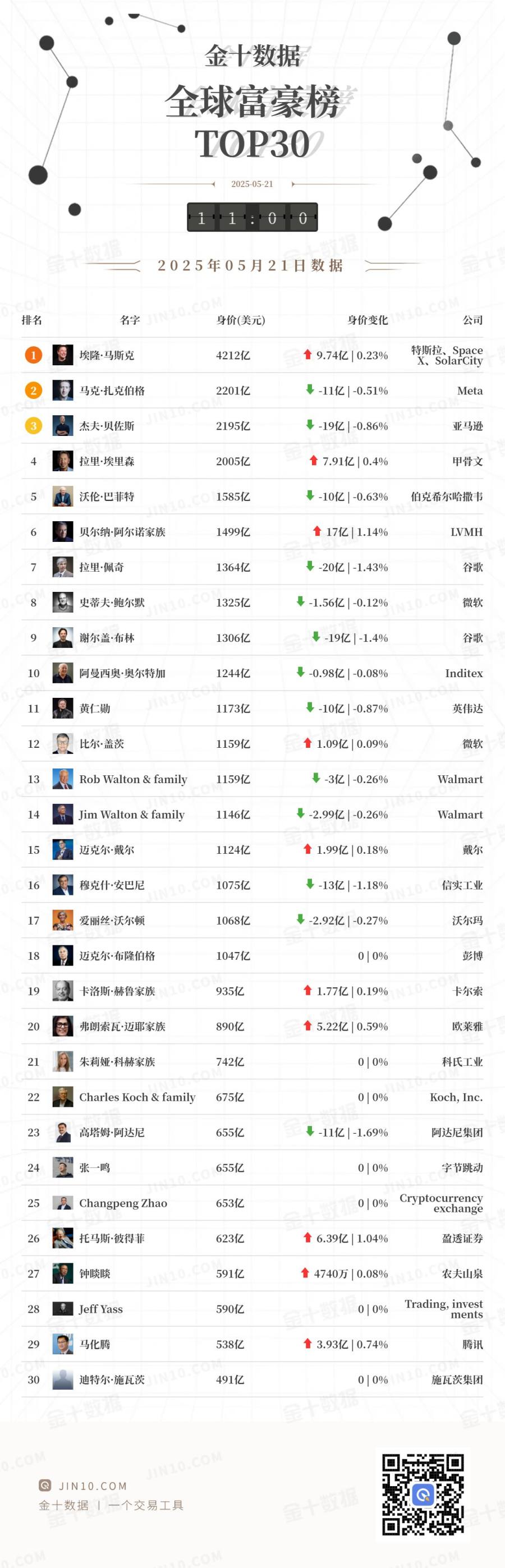 金十图示:2025年05月21日(周三)全球富豪榜