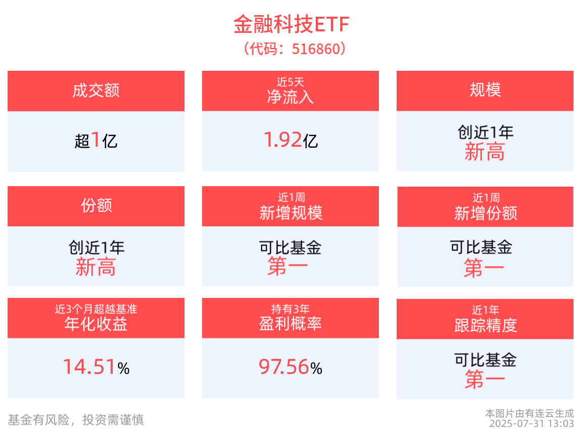 截至2025年7月31日 13:03,中证金融科技主题指数(930986)上涨0.34%,成分股数字认证(300579)上涨20.00%,新致软件(688590)上涨11.98%,税友股份 (603171)上涨7.43%,星环科技(688031)上涨6.39%,拓尔思(300229)上涨5.95%。金融科技ETF(516860)上涨0.28%,最新价报1.45元。拉长时间看,截至2025 年7月30日,金融科技ETF近1周累计上涨0.70%。 流动性方面,金融科技ETF盘中换手7.05%,成交1.12亿元。拉长时间看,截至7月30日,金融科技ETF近1周日均成交2.19亿元。 消息面上,7月30日,高层重要会议部署"十五五"规划建议及下半年经济工作,会议关于科技政策的表述为"要坚定不移深化改革。坚持以科技创新引领新质 生产力发展,加快培育具有国际竞争力的新兴支柱产业,推动科技创新和产业创新深度融合发展。纵深推进全国统一大市场建设,推动市场竞争秩序持续优 化。依法依规治理企业无序竞争。推进重点行业产能治理。规范地方招商引资行为。坚持"两个毫不动摇",激发各类经营主体活力"。另一方面,会议明 确"宏观政策要持续发 ...