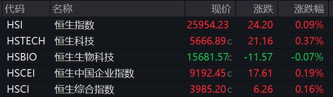 11月19日,香港恒生指数开盘涨0.09%,恒生科技指数涨0.37%。 | 代码 | 名称 | 现价 | 涨跌 | 涨跌幅 | | --- | --- | --- | --- | --- | | Hal | 恒生指数 | 25954.23 | 24.20 | 0.09% | | HSTECH 恒生科技 | | 5666.89c | 21.16 | 0.37% | | HSBIO | 恒生生物科技 | 15681.57c | -11.57 | -0.07% | | HSCEI | 恒生中国企业指数 | 9192.45c | 17.61 | 0.19% | | HSCI | 恒生综合指数 | 3985.20c | 6.26 | 0.16% | 盘面上看,电气设备、有色金属、半导体、国防军工、传媒等板块涨幅居前,化工、建材、食品饮料、 银行等板块下跌。 | 6618.HK | 67.550 | 0.82% | | --- | --- | --- | | 中商国际 | 74.600 | 0.81% | | 0981.HK | | | | 阿里巴巴-W | 155.800 | 0.78% | | 9988.HK | | ...