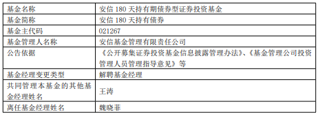 | 基金名称 | 安信 180天持有期债券型证券投资基金 | | --- | --- | | 基金简称 | 安信 180 天持有债券 | | 基金主代码 | 021267 | | 基金管理人名称 | 安信基金管理有限责任公司 | | 公告依据 | 《公开募集证券投资基金信息披露管理办法》、《基金管理公司投资 | | | 管理人员管理指导意见》等 | | 基金经理变更类型 | 解聘基金经理 | | 共同管理本基金的其他基 | 王寿 | | 金经理姓名 | | | 离任基金经理姓名 | 魏晓菲 | 中国经济网北京9月10日讯 今日,安信基金公告,魏晓菲离任安信180天持有债券基金。 魏晓菲2009年12月至2016年4月担任安信基金管理有限责任公司固定收益部基金经理助理、投资经 理;2016年4年至2017年4月担任中泰证券(上海)资产管理有限公司机构投资部投资经理;2017年4月加 入华润元大基金管理有限公司,担任专户投资部投资经理,现任安信基金管理有限责任公司固定收益部 基金经理。 安信180天持有债券A/C成立于2024年8月27日,截至2025年9月9日,其今年来收益率为1.55%、 1.40%,成立来收 ...