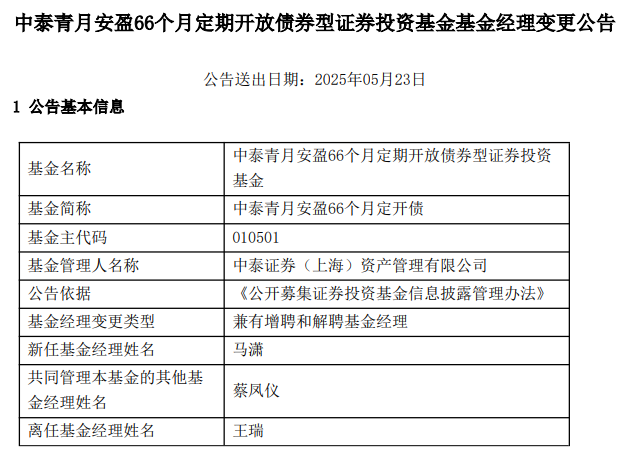 | 基金名称 | 中泰青月安盈66个月定期开放债券型证券投资 | | --- | --- | | | 基金 | | 基金简称 | 中泰青月安盈66个月定开债 | | 基金主代码 | 010501 | | 基金管理人名称 | 中泰证券(上海)资产管理有限公司 | | 公告依据 | 《公开募集证券投资基金信息披露管理办法》 | | 基金经理变更类型 | 兼有增聘和解聘基金经理 | | 新任基金经理姓名 | 马流 | | 共同管理本基金的其他基 | 察凤仪 | | 金经理姓名 | | | 离任基金经理姓名 | 王瑞 | (责任编辑:李荣) 中国经济网北京5月23日讯 今日,中泰证券(上海)资产管理有限公司公告称,中泰青月安盈66个 月定开债(010501)增聘基金经理马潇,王瑞离任。 马潇2017年7月加入中泰证券(上海)资产管理有限公司任交易部交易员,现任固收公募投资部基 金经理。 中泰青月安盈66个月定开债成立于2020年11月23日,截至2025年5月16日,其今年来收益率为 1.51%,成立来收益率为20.55%,累计净值为1.1920元。截至2025年3月31日,该基金规模85.72亿元。 ...