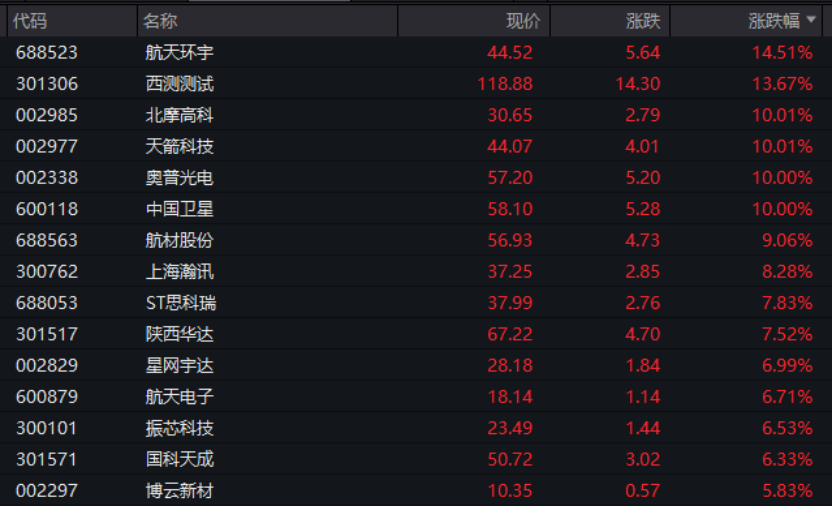 国防军工板块多股涨停。 今天(12月18日)A股市场整体出现一定分化,创业板指走低,上证指数小幅上涨。 板块方面,国防军工板块大涨,成为上午市场主要亮点之一。 创业板走低 国防军工板块大涨 今天(12月18日)A股市场整体出现一定分化,创业板指盘中跌幅一度超过2%,上证指数低开后快速拉升翻红。 行业板块和赛道方面,若按照申万一级行业划分,国防军工板块领涨,板块盘中涨幅一度逼近2%。航天环宇盘中涨幅一度超过18%,西 测测试(301306)盘中涨幅一度超过17%。天箭科技(002977)、北摩高科(002985)、奥普光电(002338)、中国卫星(600118)等股 票涨停,另有多股涨幅超过5%。 | 代码 | 名称 | 现价 | 涨跌 | 涨跌幅▼ | | --- | --- | --- | --- | --- | | 688523 | 航天环宇 | 44.52 | 5.64 | 14.51% | | 301306 | 西测测试 | 118.88 | 14.30 | 13.67% | | 002985 | 北摩高科 | 30.65 | 2.79 | 10.01% | | 002977 | 天箭科技 | 44 ...