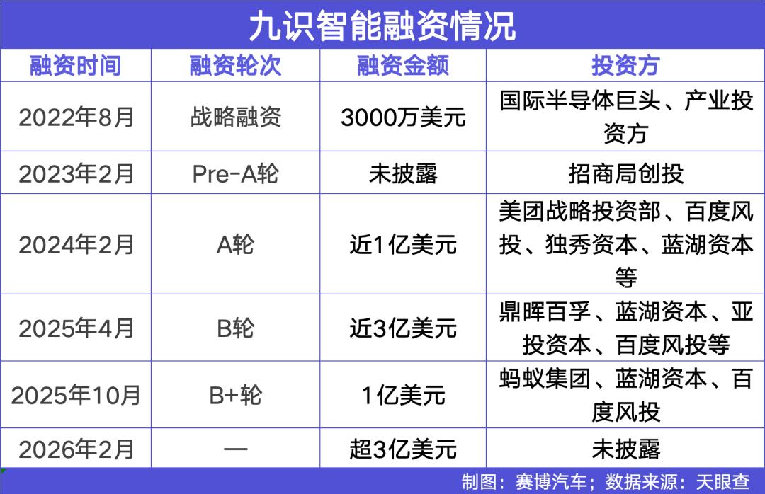自动驾驶赛道又迎好消息。 近日,无人驾驶公司九识智能完成新一轮超3亿美元融资。此前,九识智能已完成5轮融资。至此,九识智能累计公开融资额已远超8亿美元(约合人民币 55亿元),公司估值突破百亿元大关。 | | | 九识智能融资情况 | | | --- | --- | --- | --- | | 融资时间 | 融资轮次 | 融资会频 | 投资元 | | 2022年8月 | 战略融资 | 3000万美元 | 国际半导体巨头、产业投 | | | | | 资方 | | 2023年2月 | Pre-A轮 | 未披露 | 招商局创投 | | 2024年2月 | A轮 | 近1亿美元 | 美团战略投资部、百度风 投、独秀资本、蓝湖资本 | | | | | 業 | | 2025年4月 | B轮 | 近3亿美元 | 鼎晖百孚、蓝湖资本、亚 | | | | | 投资本、百度风投等 | | 2025年10月 | B+轮 | 1 亿美元 | 蚂蚁集团、蓝湖资本、百 | | | | | 度风投 | | 2026年2月 | | 超3亿美元 | 未披露 | | | | | 制图:赛博汽车;数据来源:天眼查 | 这家成立于2021年的公司, ...