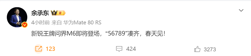 问界全新车型,首次正式官宣。 2月2日,华为常务董事、产品投资评审委员会主任、终端BG董事长余承东在微博宣布:"新锐王牌问界M6即将登场,'56789'凑齐,春 天见!" 图片来源:余承东微博 随后,余承东转发鸿蒙智行官方微博发布的悬念视频。鸿蒙智行官方称:"问界黑马,超6登场!" 图片来源:余承东微博 记者注意到,2026年1月,问界M6的冬季测试影像在互联网曝光,该款新车在五大连池测试场进行场地测试,虽身披伪装贴纸,但能看 清轮廓。测试影像一经发布,立即引发广泛关注与讨论,市场对于问界M6的新锐形象与旗舰同源技术充满猜想。 在2025年12月9日举行的鸿蒙智行年度直播中,余承东曾透露,2026年鸿蒙智行五个界的产品矩阵会补齐,比如问界缺了的M6。 具体来看,鸿蒙智行的"五界"矩阵对应了不同的细分市场,其中和赛力斯合作的问界面向高端家用领域。即将登场的问界M6将主攻年轻 市场。 2026年1月13日,"AITO问界第100万辆整车下线"活动举行,问界迎来第100万辆新车。根据鸿蒙智行最新规划,在首个百万辆用时五年 的基础上,问界将力争两年内实现第二个百万辆目标。 2月1日,鸿蒙智行交出了一份亮丽的成绩单:2 ...