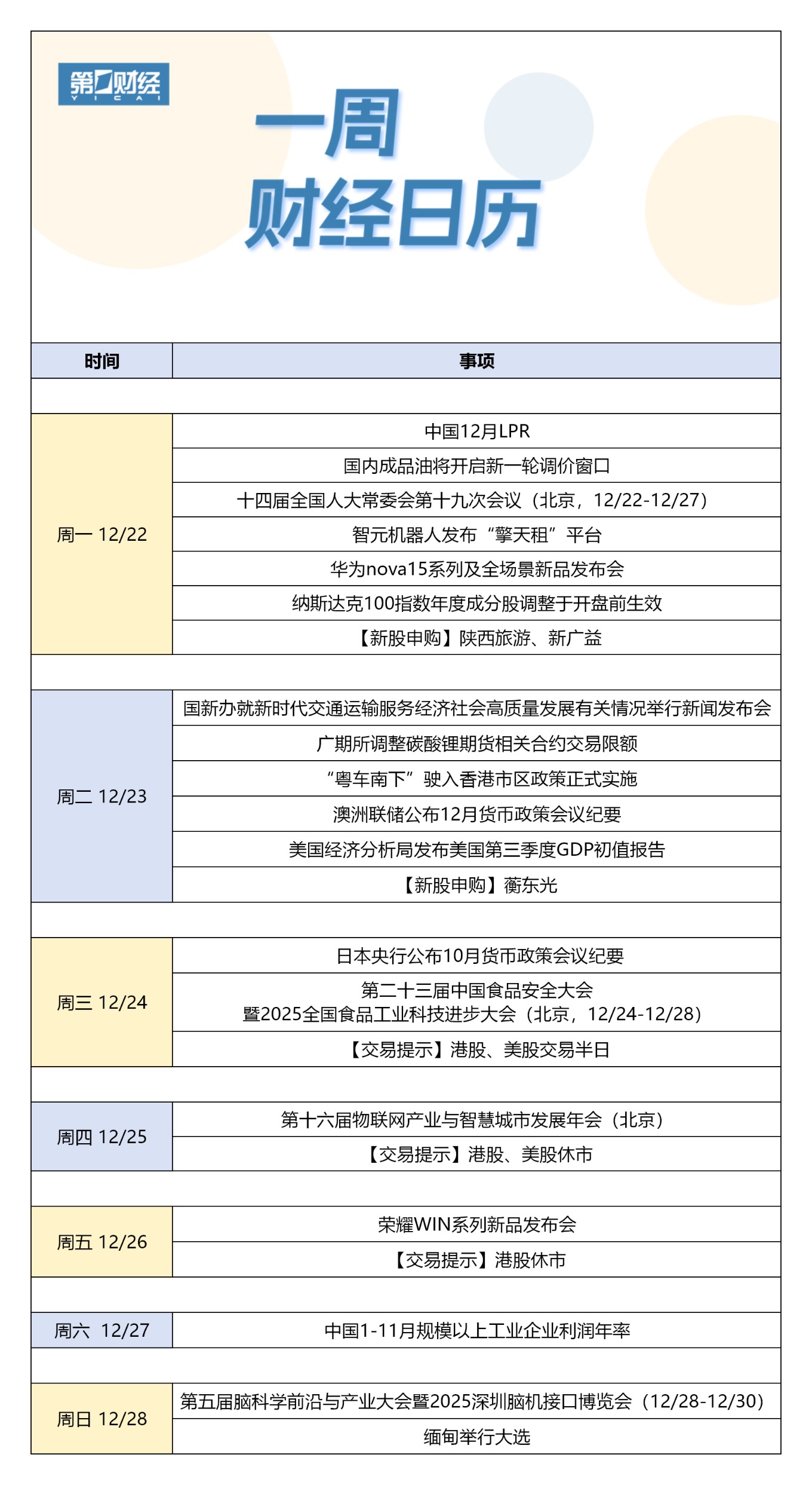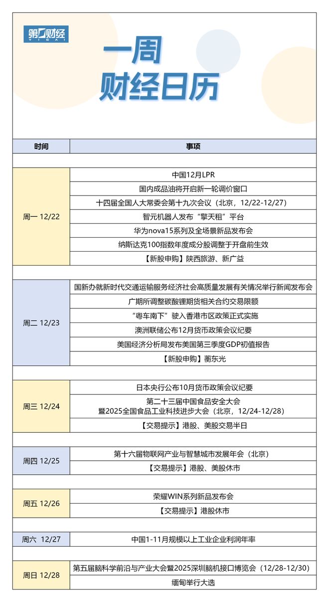周六 12/27 中国1-11月规模以上工业企业利润年率 第五届脑科学前沿与产业大会暨2025深圳脑机接口博览会 (12/28-12/30) 周日 12/28 缅甸举行大选 | 第二则结 | | | --- | --- | | | 财经目历 | | 时间 | 日前 | | | 中国12月LPR 国内成品油将开启新一轮调价窗口 | | | 十四届全国人大常委会第十九次会议 (北京, 12/22-12/27) | | 周一 12/22 | 智元机器人发布"攀天租"平台 | | | 华为nova15系列及全场景新品发布会 | | | 纳斯达克100指数年度成分股调整于开盘前生效 | | | 【新股申购】陕西旅游、新广益 | | | 国新办就新时代交通运输服务经济社会高质量发展有关情况举行新闻发布会 | | | 广期所调整碳酸锂期货相关合约交易限额 | | | "粤车南下"驶入香港市区政策正式实施 | | 周二 12/23 | 澳洲联储公布12月货币政策会议纪要 | | | 美国经济分析局发布美国第三季度GDP初值报告 | | | 【新股申购】 衡东光 | | | 日本央行公布10月货币政策会议纪要 | | 周三 1 ...