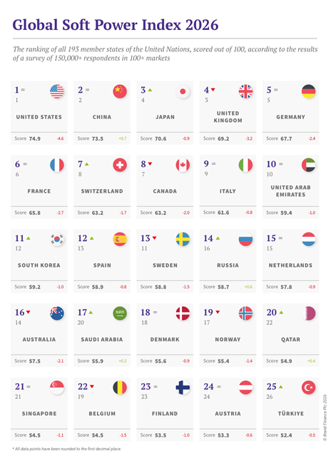 专题:世界经济论坛年会_2026冬季达沃斯 新浪财经在冬季达沃斯对话了品牌金融(Brand Finance) 集团董事长大卫·海格。海格表示,品牌金融 在过去7年一直在评估公众对国家的看法与认知。在最新一期的《2026全球软实力指数》中,中国是前 十名中唯一排名上升的国家。 "该表格中最引人注目的结果,是中国作为软实力的崛起。美国和中国之间软实力的差距已经缩小。事 实上,在过去两三年所有的评估指标中,中国都或多或少有所加强,尤其是去年。" "结果显示中国的总分正在迅速逼近美国,相比之下(美国的评分)去年急剧下降。我们实际上认为中 国今年可能会第一,对此我们会持续关注。"大卫·海格对新浪财经坦言。 今日(19日),《Brand Finance 2026年全球品牌价值500强榜单报告》在瑞士达沃斯正式发布。榜单显 示,以苹果持续领跑榜单,美国共有192个品牌入选,合计贡献了总品牌价值的53.4%。中国凭借68个 品牌位居第二位,占比达15.1%,其中抖音的品牌价值最高。 "全球品牌价值500强中,有68个中国品牌。在这68个品牌中,我大概知道10个。"大卫·海格对新浪财经 表示。他坦言,很多中国品牌的产品品质优秀 ...