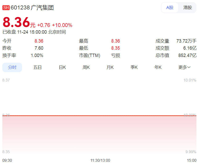 近期,广汽集团(601238.SH)股价强势涨停,成为A股汽车板块的热门焦点。此次股价表现主要得益于公司在电池技术上的重大突破——全固态电池中试 产线正式建成投产,这一进展被市场视为关键的积极信号。同时在品牌动态方面,广汽与华为联合打造的启境汽车于上周四的华为乾崑生态大会中露出冰山 一角。 不留余地All in 释放1+1>2势能 启境汽车是广汽与华为 "嵌入式协作" 的结晶:自今年 1 月起,华为数百人团队驻场合署办公,与广汽组建联合运营体,全程介入产品定义、研发到营销全 链条。品牌精准锚定年轻时尚用户,2026 年将同步推出 SUV 与轿车双品类,首款 "华系最美猎装轿跑" 已完成极端环境测试与设计定型,计划明年 6 月上 市交付,全栈搭载华为乾崑智能解决方案。 | SH601238 广汽集团 | | | | | | A股 | 港股 | | --- | --- | --- | --- | --- | --- | --- | --- | | 8.36元 +0.76 +10.00% 已收盘 11-24 15:00:00 北京时间 | | | | | | | | | 今开 | 8.36 | | 最高 | 8.3 ...