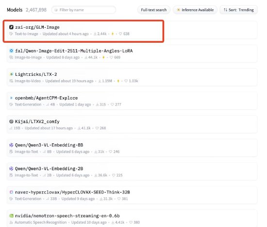 新浪科技讯 1月16日上午消息,智谱联合华为开源新一代图像生成模型GLM-Image,宣布基于昇腾Atlas 800T A2设备和昇思MindSpore AI框架完成从数据到训练的全流程。 据悉,该模型开源不到24小时即冲上全球知名AI开源社区Hugging Face榜单的全球第一。不同于开源常 用的LDM方案,GLM-Image采用了创新的"自回归+扩散解码器"混合架构,兼顾全局指令理解与局部细 节刻画,克服了海报、PPT、科普图等知识密集型场景生成难题,尤其擅长汉字生成任务,向探索以 Nano Banana Pro为代表的"知识+推理"的认知型生成模型迈出了重要一步。 从训练过程看,GLM-Image实现了基于昇腾Atlas 800T A2设备和昇思MindSpore AI框架的全流程训练及 推理适配,实际训练性能足以达到相应计算设备的汇报性能上限,验证了在国产全栈算力底座上训练前 沿模型的可行性。 | Models 2,467,898 Filter by name | Full-text search Inference Available | 11 Sort: Trending | | --- | - ...