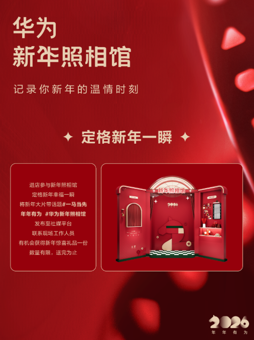 春节将至,你是否也在寻找一种更有仪式感的方式,来记录团圆、开启新岁? 近日,华为正式官宣"新年照相馆"活动,并将于2026年1月24日起在全国多座城市的核心商圈陆续 开馆。在华为新年照相馆,只需三步,你不仅能获得新年的第一张大片,更能体验一场融合鸿蒙智慧、 技术创新与情感温度的新春影像之旅。 第一步:一键报名,轻松入场 打开我的华为App,查看"新年照相馆"的活动场次,选择合适的时间和地点,点击报名。 第二步:步入七大展区,体验沉浸式新年写真拍摄 在"主角登场,高光上演"展区,支持与家人、朋友拍摄新年合影,还能通过"碰一碰"、"华为分 享"功能一键传输、即时打印,让分享轻松无界。若喜爱自拍,"红枫好戏,自拍成片"展区可为你提供 华为红枫摄像头带来的高清自拍体验,拍摄完成后,照片可一键流转至宣发区进行创意编辑。随后你可 以通过"一键成片"或"小艺修图"快速生成新年照片,将瞬间定格为专属纪念。 第三步:打卡互动,带走限定好礼 为提升用户参与感,"新年照相馆"活动特别设置互动打卡福利机制。完成指定打卡任务,即可获赠 限定好礼。同时,所有参与者还可现场免费打印照片,亲手制作冰箱贴、钥匙链等专属周边,让科技记 忆触手可 ...