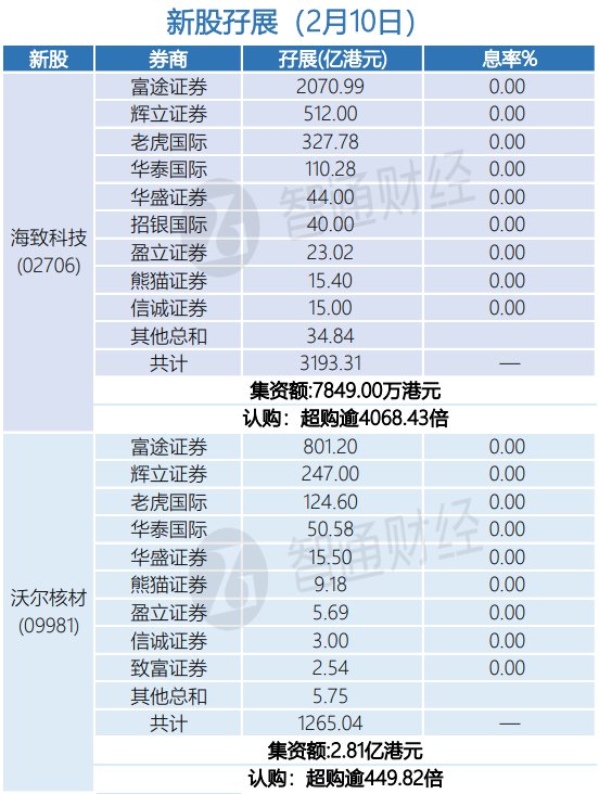 智通财经APP获悉,海致科技(02706)、沃尔核材(09981)正在招股中。截止2月9日,富途证券、老虎国 际等券商合计为海致科技借出990.81亿港元,超购逾1262.34倍;为沃尔核材借出164.26亿港元,超购逾 58.41倍。 | | 新版好展 (2月9日) | | | | --- | --- | --- | --- | | 新股 | 券商 | 子展(亿港元) | 息率% | | 海致科技 | 富途让芬 | 720.97 | 0.00 | | | 老虎国际 | 135.69 | 0.00 | | | 华泰国际 | 39.45 | 0.00 | | | 华盛证券 | 20.20 | 0.00 | | | 盈立证券 | - 17.89 | 0.00 | | | 信诚证券 | 15.00 | 0.00 | | (02706) | 致富证券 | 10.48 | 0.00 | | | 熊猫证券 | 9.07 | 0.00 | | | 辉立证券 | 9.00 | 0.00 | | | 其他总和 | 13.05 | | | | 共计 | 990.81 | | | | | 集资额:7849.00万港元 | | | ...