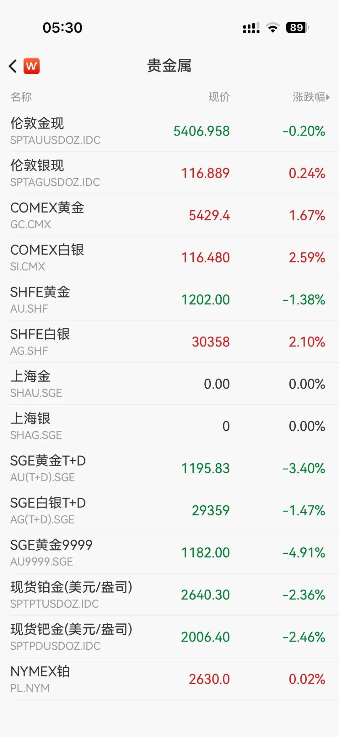 美东时间周四,美股三大指数下探回升,贵金属价格深夜暴跌,现货黄金一度跌超5%,失守5100美元/盎司,现货白银一度跌超8%。随后,现货金银V型 反转,截至发稿基本收复跌幅。 截至收盘,道琼斯工业指数涨0.11%,纳斯达克指数跌0.72%,标普500指数跌0.13%。 | SHFE日银 | 30358 | 2.10% | | --- | --- | --- | | AG.SHF | | | | 上海金 | 0.00 | 0.00% | | SHAU.SGE | | | | 上海银 | 0 | 0.00% | | SHAG.SGE | | | | SGE黄金T+D | 1195.83 | -3.40% | | AU(T+D).SGE | | | | SGE自银T+D | 29359 | -1.47% | | AG(T+D).SGE | | | | SGE黄金9999 | 1182.00 | -4.91% | | AU9999.SGE | | | | 现货铂金(美元/盎司) | 2640.30 | -2.36% | | SPTPTUSDOZ.IDC | | | | 现货把金(美元/盎司) | 2006.40 | - ...