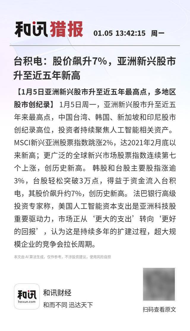 【1月5日亚洲新兴股市升至近五年最高点,多地区股市创纪录】1月5日周一,亚洲新兴股市升至近五年 来最高点,中国台湾、韩国、新加坡和印尼股市创纪录高位,投资者持续聚焦人工智能相关资产。 MSCI新兴亚洲股票指数跳涨2%,达2021年2月底以来新高;更广泛的全球新兴市场股票指数连续第七 个上涨,创历史新高。 韩股和台股主要股指涨逾3%,台股轻松突破3万点,得益于资金流入台积电, 其股价飙升约7%,创历史新高。 法巴银行高级投资专家称,美国人工智能资本支出是亚洲科技股重要 驱动力,市场正从'更大的支出'转向'更好的回报',认为这是持续多年的扩建过程,超大规模企业的竞 争会拉长周期。 和讯财经 FUL hexun.con 和而不同 迅达天下 扫码查看原文 本文由 Al 算法生成,仅作参考,不涉投资建议,使用风险自担 本文由 AI 算法生成,仅作参考,不涉投资建议,使用风险自担 ...