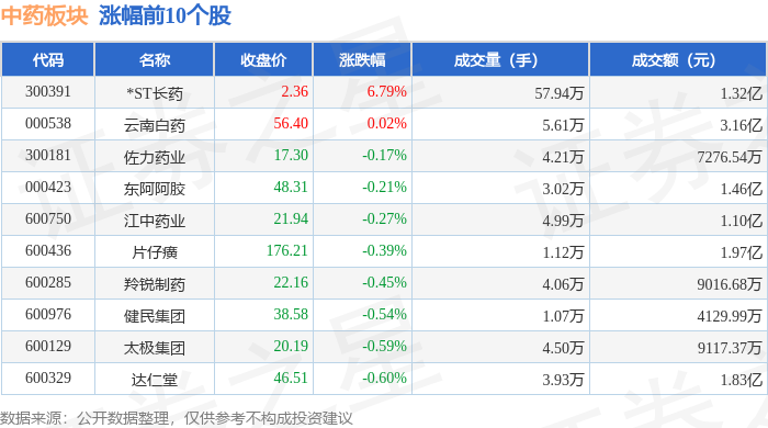 证券之星消息,11月19日中药板块较上一交易日下跌1.28%,嘉应制药领跌。当日上证指数报收于 3946.74,上涨0.18%。深证成指报收于13080.09,下跌0.0%。中药板块个股涨跌见下表: | 代码 | 名称 | 收盘价 | 涨跌幅 | 成交量(手) | 成交额(元) | | --- | --- | --- | --- | --- | --- | | 300391 | *ST长药 | 2.36 | 6.79% | 57.94万 | 1.32亿 | | 000538 | 云南白药 | 56.40 | 0.02% | 5.61万 | 3.16亿 | | 300181 | 佐力药业 | 17.30 | -0.17% | 4.21万 | 7276.54万 | | 000423 | 东阿阿胶 | 48.31 | -0.21% | 3.02万 | 1.46亿 | | 600750 | 江中药业 | 21.94 | -0.27% | 4.99万 | 1.10亿 | | 600436 | 片仔瘦 | 176.21 | -0.39% | 1.12万 | 1.97亿 | | 600285 | 羚锐制药 | 22.16 ...