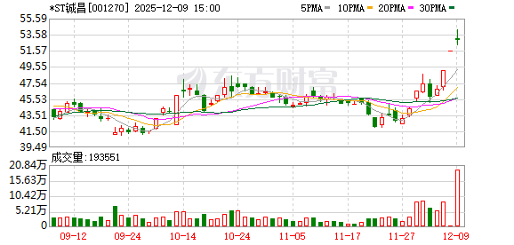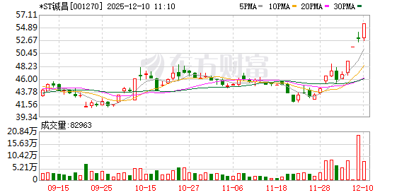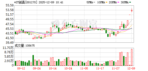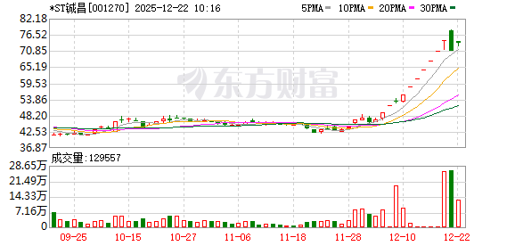 *ST铖昌再度涨停,10个交易日内录得9个涨停,累计涨幅为59.08%,累计换手率为22.38%。截至 9:29,该股今日成交量428.27万股,成交金额3.19亿元,换手率2.10%。最新A股总市值达153.35亿元, A股流通市值151.40亿元。 龙虎榜数据显示,该股因连续三个交易日内,收盘价涨幅偏离值累计达到12%的ST证券、*ST证券上榜 龙虎榜2次,买卖居前营业部中,机构净买入7213.25万元,营业部席位合计净买入1075.73万元。 近日该股表现 | 日期 | 当日涨跌幅(%) | 换手率(%) | 主力资金净流入(万元) | | --- | --- | --- | --- | | 2025.12.17 | 4.99 | 0.35 | 1381.12 | | 2025.12.16 | 4.99 | 0.23 | 1526.48 | | 2025.12.15 | 5.00 | 0.08 | 656.94 | | 2025.12.12 | 5.01 | 0.14 | 942.68 | | 2025.12.11 | 5.01 | 1.01 | 1247.60 | | 2025.12.10 | 4.9 ...