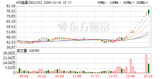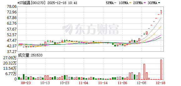 *ST铖昌再度涨停,11个交易日内录得10个涨停,累计涨幅为67.03%,累计换手率为35.09%。截至 9:33,该股今日成交量409.03万股,成交金额3.18亿元,换手率2.01%。最新A股总市值达161.02亿元, A股流通市值158.97亿元。 龙虎榜数据显示,该股因连续三个交易日内,收盘价涨幅偏离值累计达到12%的ST证券、*ST证券上榜 龙虎榜3次,买卖居前营业部中,机构净买入4777.87万元,营业部席位合计净卖出2577.53万元。 近日该股表现 | 日期 | 当日涨跌幅(%) | 换手率(%) | 主力资金净流入(万元) | | --- | --- | --- | --- | | 2025.12.18 | 5.00 | 12.81 | -2814.27 | | 2025.12.17 | 4.99 | 0.35 | 1381.12 | | 2025.12.16 | 4.99 | 0.23 | 1526.48 | | 2025.12.15 | 5.00 | 0.08 | 656.94 | | 2025.12.12 | 5.01 | 0.14 | 942.68 | | 2025.12.11 | ...