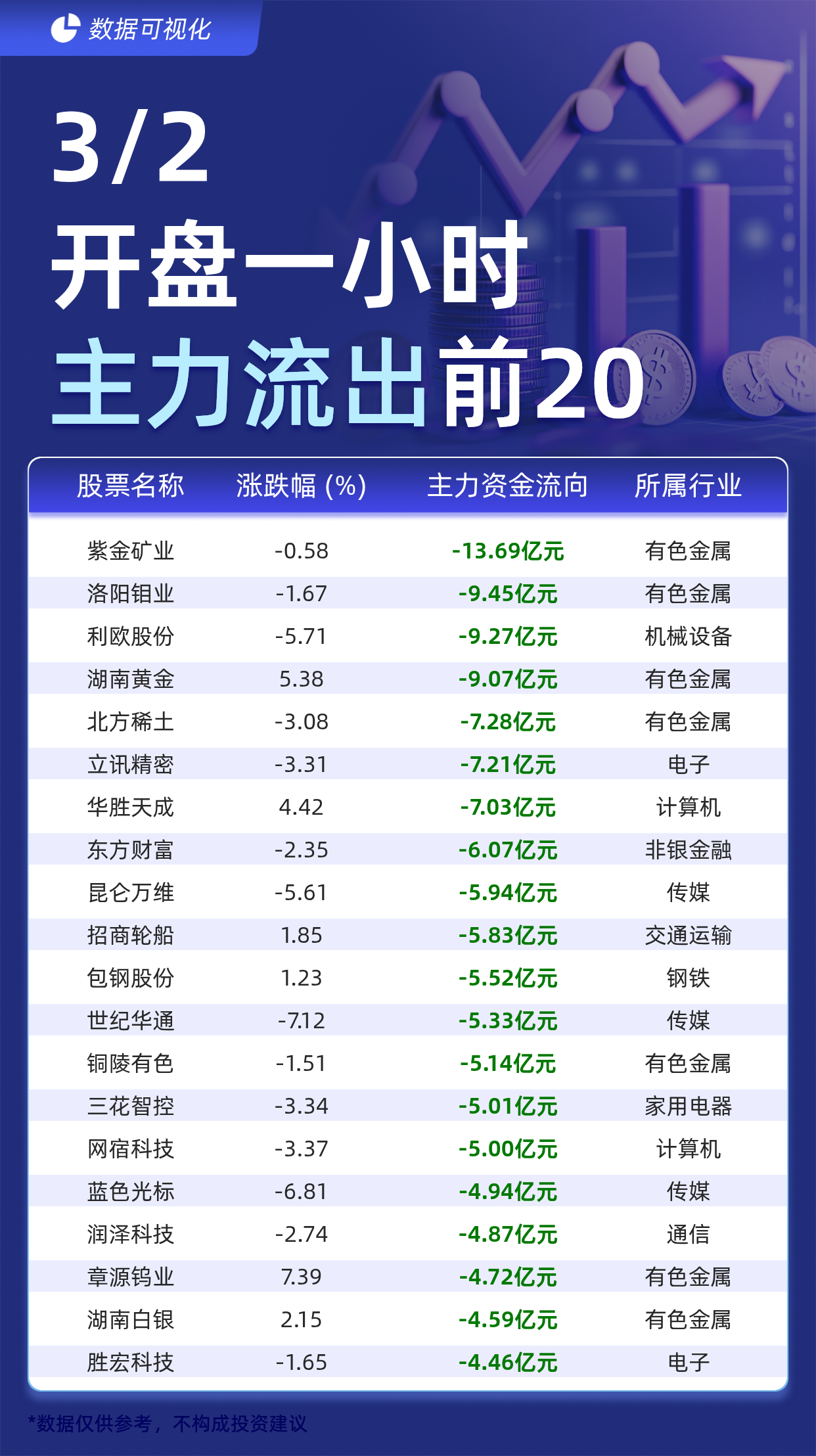 据交易所数据显示,截至3月2日开盘一小时,主力资金流出前20的股票分别为: 紫金矿业(-13.69亿元)、 洛阳钼业(-9.45亿元)、 利欧股份(-9.27亿 元)、 湖南黄金(-9.07亿元)、 北方稀土(-7.28亿元)、 立讯精密(-7.21亿元)、 华胜天成(-7.03亿元)、 东方财富(-6.07亿元)、 昆仑万维(-5.94亿 元)、 招商轮船(-5.83亿元)、 包钢股份(-5.52亿元)、 世纪华通(-5.33亿元)、铜陵有色(-5.14亿元)、 三花智控(-5.01亿元)、 网宿科技(-5.00亿 元)、 蓝色光标(-4.94亿元)、 润泽科技(-4.87亿元)、 章源钨业(-4.72亿元)、 湖南白银(-4.59亿元)、 胜宏科技(-4.46亿元)。 | 股票名称 | 涨跌幅 (%) | 主力资金流向 | 所属行) | | --- | --- | --- | --- | | 紫雯贴,不 | -0.58 | -13.69亿元 | 有色金属 | | 洛阳钼业 | -1.67 | -9.45亿元 | 有色金属 | | 利欧股份 | -5.71 | -9.27亿元 | 机械设备 | | 湖南黄金 ...