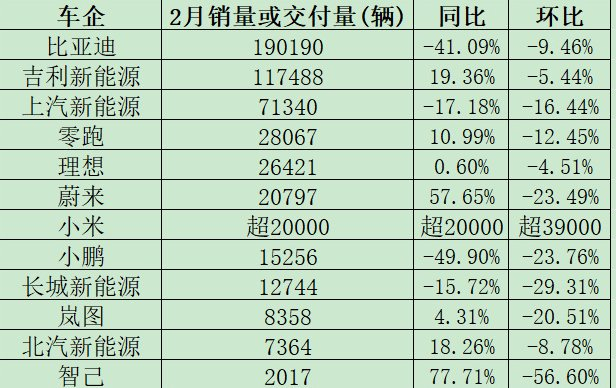 2026年春节假期叠加新能源汽车购置税新政,成为车企2月销量总体"遇冷"的重要原因。2026年春节假期较长导致汽车行业的有效产销时间大幅缩 减。 2月成为汽车行业的消费淡季,但仍有部分车企表现突出。比如,吉利旗下高端新能源汽车品牌极氪,2月销量同比增长70%至2.39万辆。 【导读】车企竞争格局又生变:零跑重夺新势力销冠,比亚迪跌破20万辆大关 3月1日,多家车企披露2月销量,总体"遇冷"成为关键词。 2月份比亚迪、上汽的销量,同比分别下降41.09%、8.64%。其中比亚迪月度销量为19.02万辆,在近年来的月度销量中首次跌破20万辆大关。 2月,头部造车新势力的竞争门槛下降至2万辆,其中零跑重夺造车新势力月度销冠,销量为2.81万辆。 接下来,汽车市场的竞争变数颇多。小米创办人,董事长兼CEO雷军发布微博称:"新一代SU7正在紧锣密鼓地准备。" | 车企 | 2月销量或交付量(辆) | 同比 | 环比 | | --- | --- | --- | --- | | 比亚迪 | 190190 | -41.09% | -9. 46% | | 吉利新能源 | 117488 | 19. 36% | -5. 44% | ...