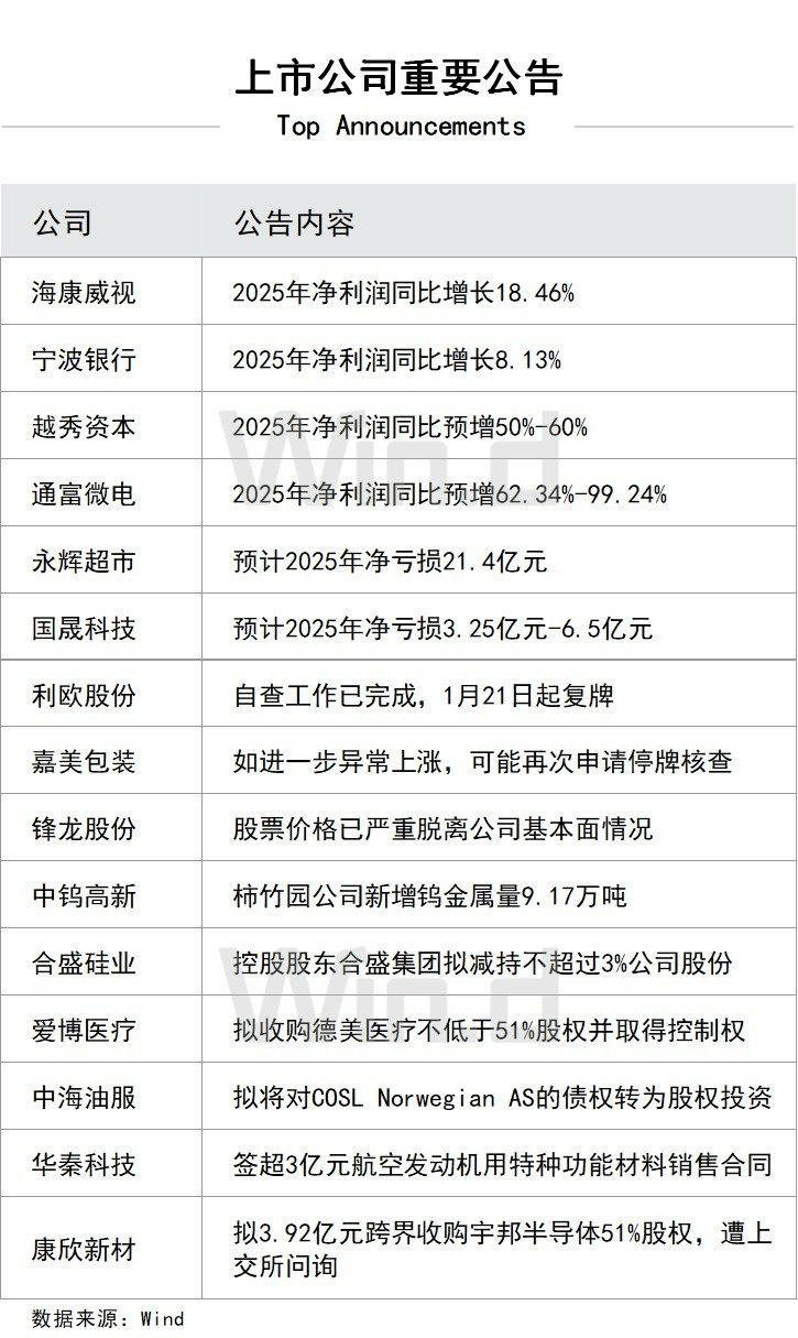 Group 1 - The China Securities Regulatory Commission has approved an adjustment to the financing margin ratio for investors, increasing the minimum margin from 80% to 100% for new financing contracts, aimed at reducing leverage and protecting investor rights [1] - The policy for tax refunds on housing transactions for residents has been extended until the end of 2027, allowing taxpayers to receive tax refunds on capital gains from selling their homes if they purchase a new home within one year [1] - A potential IPO boom is anticipated in 2026, with several top global tech companies, including OpenAI and SpaceX, preparing for their public offerings [1] Group 2 - The State Council Information Office will hold a press conference on January 15 to discuss the effectiveness of monetary and financial policies in supporting high-quality economic development [2] - China's foreign trade is projected to reach 45.47 trillion yuan in 2025, marking a 3.8% year-on-year increase, with December exports of rare earths surging by 32% [2] - The People's Bank of China will conduct a 900 billion yuan reverse repurchase operation on January 15, continuing a trend of increasing liquidity in the market [2] Group 3 - A-share market saw a trading volume nearing 4 trillion yuan, with the Shanghai Composite Index closing down 0.31% while the Shenzhen Component Index rose by 0.56% [3] - The Hong Kong Hang Seng Index increased by 0.56%, with significant net buying from southbound funds, particularly in Tencent Holdings [3] - Recent regulatory updates have imposed stricter requirements on fund dividends to ensure compliance and prevent manipulation [3] Group 4 - The insurance fund investment reform pilot has received an additional 40 billion yuan in approved funds, indicating a growing trend in long-term investments [4] - The A-share GEO (Generative Engine Optimization) concept has gained market attention, with several stocks experiencing significant price increases [4] - The Zhejiang Securities Regulatory Bureau has initiated an investigation into Sunflower's restructuring plan for misleading statements [5] Group 5 - The China Association of Automobile Manufacturers reported that both production and sales of automobiles in 2025 are expected to exceed 34 million units, maintaining China's position as the world's largest automotive market [9] - The 2026 work meeting emphasized enhancing the self-sufficiency of the supply chain in the new energy vehicle sector and promoting the application of new energy heavy trucks [9] Group 6 - The sixth batch of high-value medical consumables procurement results is expected to be implemented by May, covering various medical devices [10] - Shanghai has launched an action plan for autonomous driving, aiming to test L3-level vehicles and scale L4-level technology applications [10] Group 7 - Visa has partnered with BVNK to accelerate the adoption of digital assets in daily transactions, integrating stablecoin financing into its payment network [11] - OpenAI has signed a three-year agreement with Cerebras for a significant procurement of computing power, valued at over $10 billion [11] Group 8 - The U.S. Federal Reserve's Beige Book indicates modest to moderate economic growth across most districts, with consumer spending showing slight improvements [13] - The U.S. Treasury Department has issued warnings for citizens to leave Iran amid rising geopolitical tensions [13]