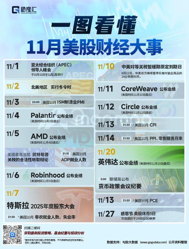 | 110 €1 | | | | | --- | --- | --- | --- | | FEEN JUS | | | | | 11/1 | 亚太经合组织(APEC) 领导人峰会 | 11/1 (0) | 中美对等关税暂缓期原定到期日 | | 于10月31日至11月1日举行 | | | 8月12日,中美双方继续暂停实施对彼此商品的 24@关税90天。 | | 11/2 | 北美地区 实行冬令时 | 11/11 | CoreWeave 公布业绩 | | 11/5 | 23:00 美国10月 ISM制造业PMI | | * * Polo Trand State | | | | 11/1 22 | Circle 公布业绩 | | 11/4 | Palantir 公布业绩 | | 美国时间11月12日盘前) | | (美国时间11月3日盘后) | | 77/4 K | 21:30 ·美国10月 CPI | | 11/5 | AM 公布业绩 | 11/14 | 21:30 ·美国10月 PPI、零售销售月率 | | 21:15 | 美国10月 | 11/240) | | | 美國最高法院 就特朗普 | 关税的合法性听取 ...