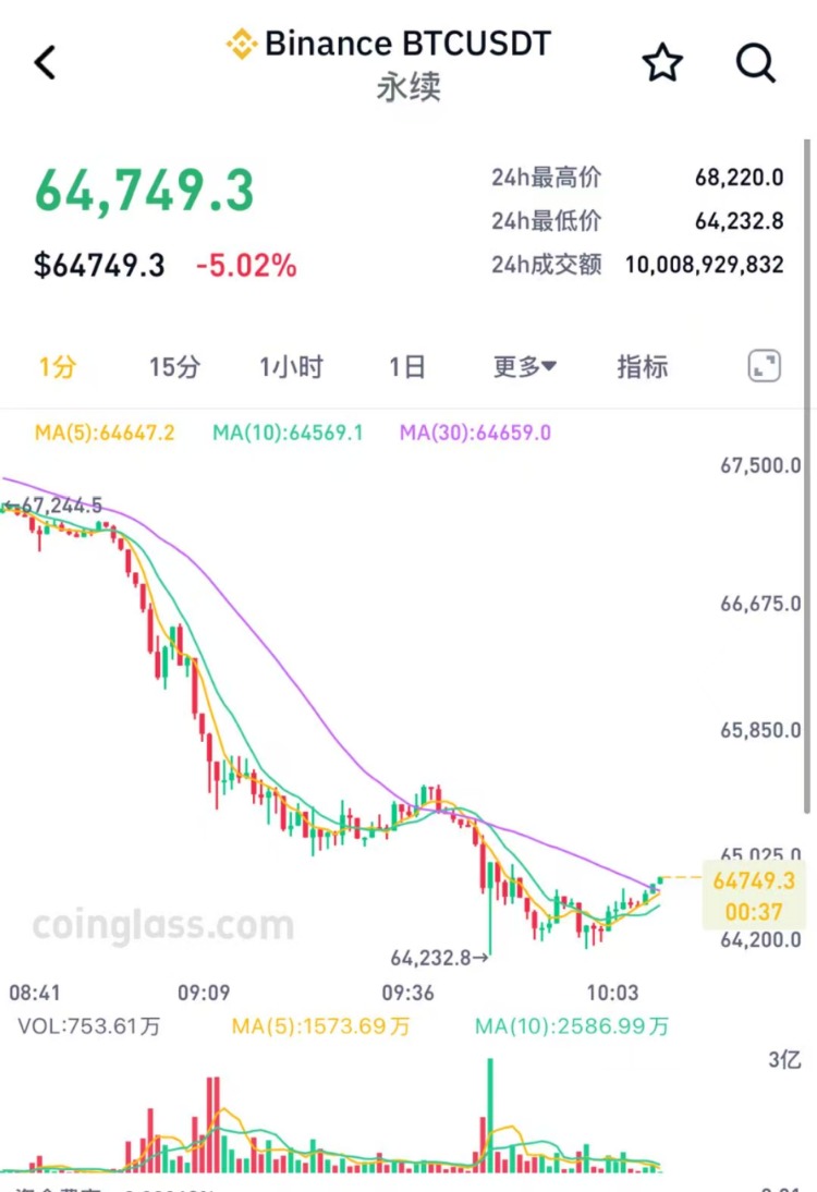 2月23日,比特币直线下跌,跌破65000美元关口,最低报64232.8美元/枚。截至发稿,报64749.3美元/枚,跌幅超5%。 加密货币市场整体呈现下跌态势。截至发稿,以太坊、XRP币、BNB币跌幅均超6%,HYPE币跌幅超7%,SOL币跌幅超8%。 | 排名 | 币种 | | 价格 价格(24h%) | 资金费率 | 24小时成交额 | 成交额(24h%) | 市值 | | --- | --- | --- | --- | --- | --- | --- | --- | | ☆ = 1 = = | B BTC | $64634.1 | -5.15% | -0.0006% | $454.93亿 | +42.61% | $1.29万亿 | | 公 | + ETH | $1860.68 | -6.02% | -0.0138% | $316.60亿 | +49.63% | $2246.14亿 | | な | SOL | $78 | -8.64% | -0.0186% | $77.27亿 | +34.69% | $444.60亿 | | ☆ 4 | X XRP | $1.3372 | -6.52% | -0.015 ...