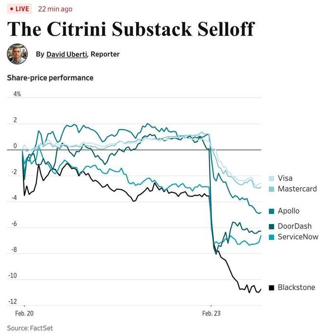 来源:搜狐科技 Citrini Research日前发布报告,详细分析了人工智能(AI)可能给全球经济多个领域带来的潜在风险, 导致送餐、支付和软件类股票周一大幅下跌。 Citrini 报告中特别提到的板块包括:食品配送(DASH -7%,UBER -4%)、支付(AXP -8%,V -5%, MA -6%)、私募信贷/替代货币(OWL -4%,AP -5%,BX -6%)、软件(NOW -4%,CRM -4%)和 IT 服务(INFY -5%)。 DoorDash.、American Express、KKR & Co Inc.和Blackstone股价周一盘中均下跌超过8%。文章中被点名 的其他公司,包括Uber、Mastercard、Visa、Capital One和Apollo Global Management Inc.,股价也至少 下跌3%。 媒体表示,这份报告阴暗的描绘,让近期本已因AI颠覆风险和地缘政治动荡而多次震荡的股市更加焦 虑。 Grizzle Investment Management的投资组合经理Thomas George表示: Citrini Research由James van G ...