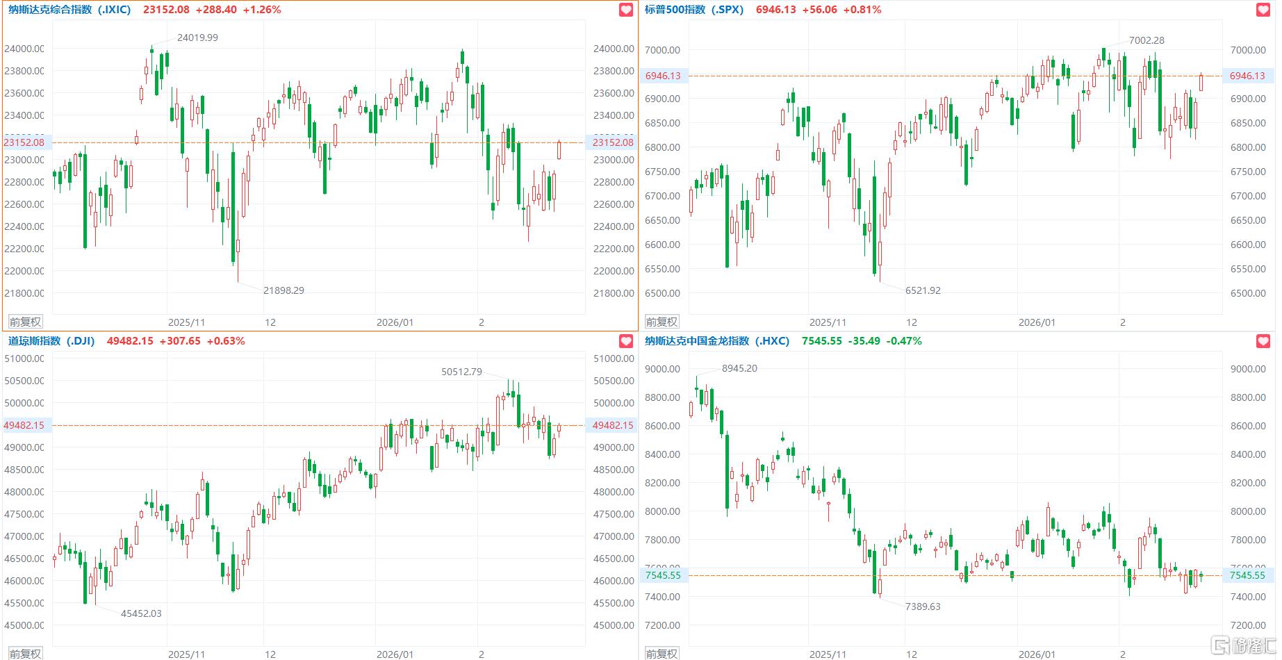 隔夜全球资本市场迎来普涨行情,欧美股市全线走高,科技股成为上涨核心驱动力,贵金属、大宗商品同步异动。而美股盘后算力龙头英伟达发布的超预期 财报,更是进一步点燃市场情绪,成为当日全球市场的绝对焦点。 当地时间2月25日,美股三大指数全线收涨,连续两个交易日携手上行。Wind数据显示,截至收盘,道琼斯工业指数涨0.63%,报 49482.15点;纳斯达克指 数涨1.26%,报23152.08点;标普500指数涨0.81%,报6946.13点。欧洲市场同步走强,截至收盘,法国CAC40指数涨0.47%,英国富时100指数涨1.18%,德 国DAX指数涨0.76%。 | 美股指数 | | | | --- | --- | --- | | 道琼斯 | 纳斯达克 | 标普5( | | 49482.15 | 23152.08 | 6946. | | +307.65 +0.63% +288.40 +1.26% +56.06 + | | | | 中国金龙 | 纳指100期货 | 标普500 | | 7545.55 | 25344.25 | 6954 .! | | -35.49 -0.47% -37.75 -0.15% | | - ...