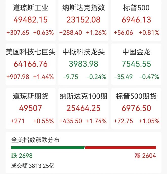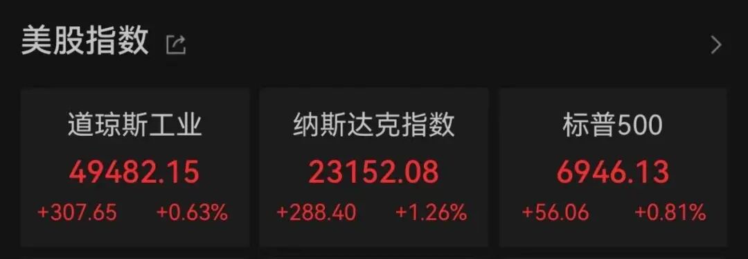 记者丨刘雪莹 编辑丨曾静娇 周三(2月25日),美国三大股指全线收涨,纳指涨超1%。 | 道琼斯工业 | 纳斯达克指数 | 标普500 | | --- | --- | --- | | 49482.15 | 23152.08 | 6946.13 | | +307.65 +0.63% +288.40 +1.26% +56.06 +0.81% | | | | 美国科技七巨头 中概科技龙头 | | 中国金龙 | | 64166.76 | 3983.98 | 7545.55 | | +907.98 +1.44% -9.75 -0.24% -35.49 -0.47% | | | | 道琼斯期货 | 纳斯达克100期 | 标普500期货 | | 49507 | 25464.25 | 6976.50 | | +271 +0.55% +435.50 +1.74% +72.75 +1.05% | | | | 全美指数涨跌分布 | | | | 跌 2698 | | 涨 2604 | 大型科技股集体上涨,微软涨近3%,脸书涨超2%,特斯拉涨近2%,英伟达涨1.4%。 芯片股多数上涨,应用材料涨超4%,泰瑞达涨逾4%,迈威尔科技涨超3 ...