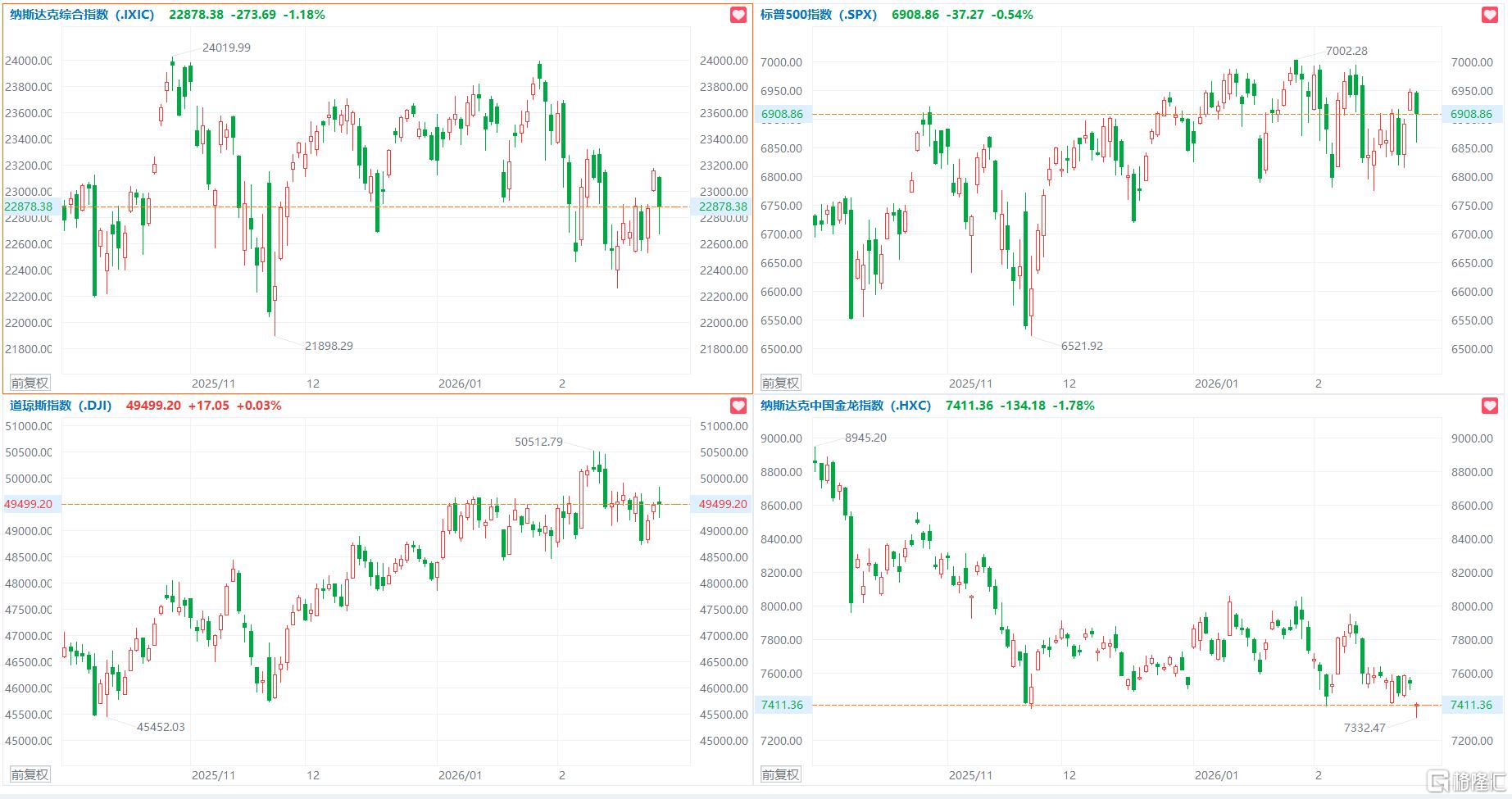 纳斯达克中国金龙指数收跌1.78%,热门中概股里,百度收跌5.6%,比亚迪跌4.2%,美团跌3.2%,理想跌3%,阿里巴巴跌2.8%,小米、小鹏、文远知行、 蔚来跌超2%,小马智行涨4.7%。 美股三大指数收盘涨跌不一,纳指跌1.18%,标普500指数跌0.54%,道指涨0.03%。大型科技股多数下跌,英伟达跌超5%,创去年4月16日以来最大单日跌 幅;英特尔跌逾3%,特斯拉跌超2%,谷歌、亚马逊跌超1%,苹果小幅下跌;奈飞涨超2%,微软、Meta小幅上涨。美股量子计算板块普涨,IonQ Inc涨超 21%,Rigetti Computing涨超5%,Arqit Quantum涨超3%,SEALSQ Corp、D-Wave Quantum涨超2%。 ...