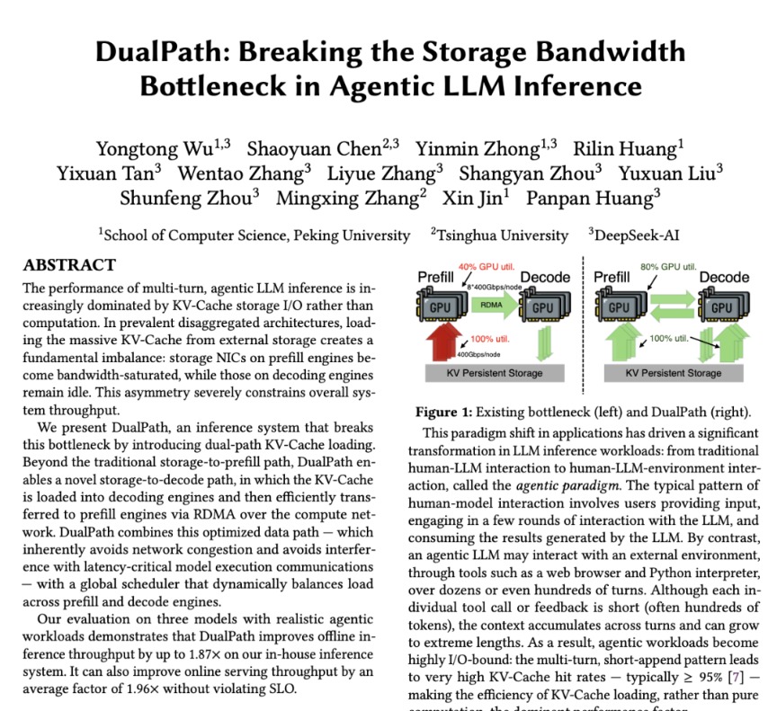论文延续DeepSeek一贯的风格,在工程化层面将性能优化推向极致。 在业界对新一代旗舰模型DeepSeek V4的翘首期盼中,DeepSeek团队却悄然放出了一篇新的学术论文。 这篇论文由DeepSeek联合北大、清华共同撰写,将研究方向投向了决定大模型实际应用落地的关键一环——推理速度,为日益复杂的AI智能体,提供一套 高效的底层系统解决方案。 论文在引言部分提到,大模型正从单轮对话机器人和独立推理模型,快速演进为智能体系统 ——能够自主规划、调用工具,并通过多轮交互解决实际任 务。这种应用范式的转变,推动大模型推理工作负载发生重大变革:从传统的人类-大模型交互,转向人类-大模型-环境交互,交互轮次可达数十甚至数百 轮。 上下文会跨轮次累积,最终长度可能达到极值。此时模型不需要大量计算,反而需要频繁从硬盘读取历史上下文的 KV-Cache;现有系统中,只有负责预处 理的引擎会读取KV-Cache,它的网卡带宽被占满,而负责生成内容的解码引擎,网卡带宽基本闲置,导致整个系统速度被卡脖子。 因此,论文提出的DualPath,针对智能体工作负载、重新设计现代推理架构中 KV-Cache加载逻辑,解决大模型做智能 ...