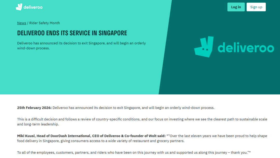 关注"墨腾创投"⭐,不错过最新行业洞察 昨天,正在积极推进全球扩张的美国头部外卖平台DoorDash宣布,将关闭旗下Deliveroo和Wolt两个品牌在四个国家的运营:卡塔尔、新加坡、日本和乌兹 别克斯坦。 DoorDash于2025年完成了对总部在英国的Deliveroo的收购。此前,它在2022年收购了总部位于芬兰的Wolt。 这一次,Deliveroo退出新加坡市场的消息引起了墨腾身边不少朋友的关注 - 尤其是喜欢吃健康色拉的朋友。 Deliveroo自2015年起就在新加坡运营,过去几年里,它逐步收缩战线,更多聚焦于高端用户,而不是与Grab和Foodpanda在大众市场正面竞争。 2. 事实上,在Deliveroo于2025年4月退出香港之后,一些行业观察者已经开始猜测新加坡是否会是下一个。我们并不清楚Deliveroo当时为何保留新加坡市 场 - 但他们显然最终必须要做出一个战略决策。在外卖平台业务中,"规模不足"的市场位置会随着时间推移而持续恶化。要么投入资源争取规模密 度,要么退出。很难存在一个长期稳定的中间状态; 3. 新加坡本身并不是一个特别小的市场 - 我们追踪到2025年新加坡外卖平 ...
