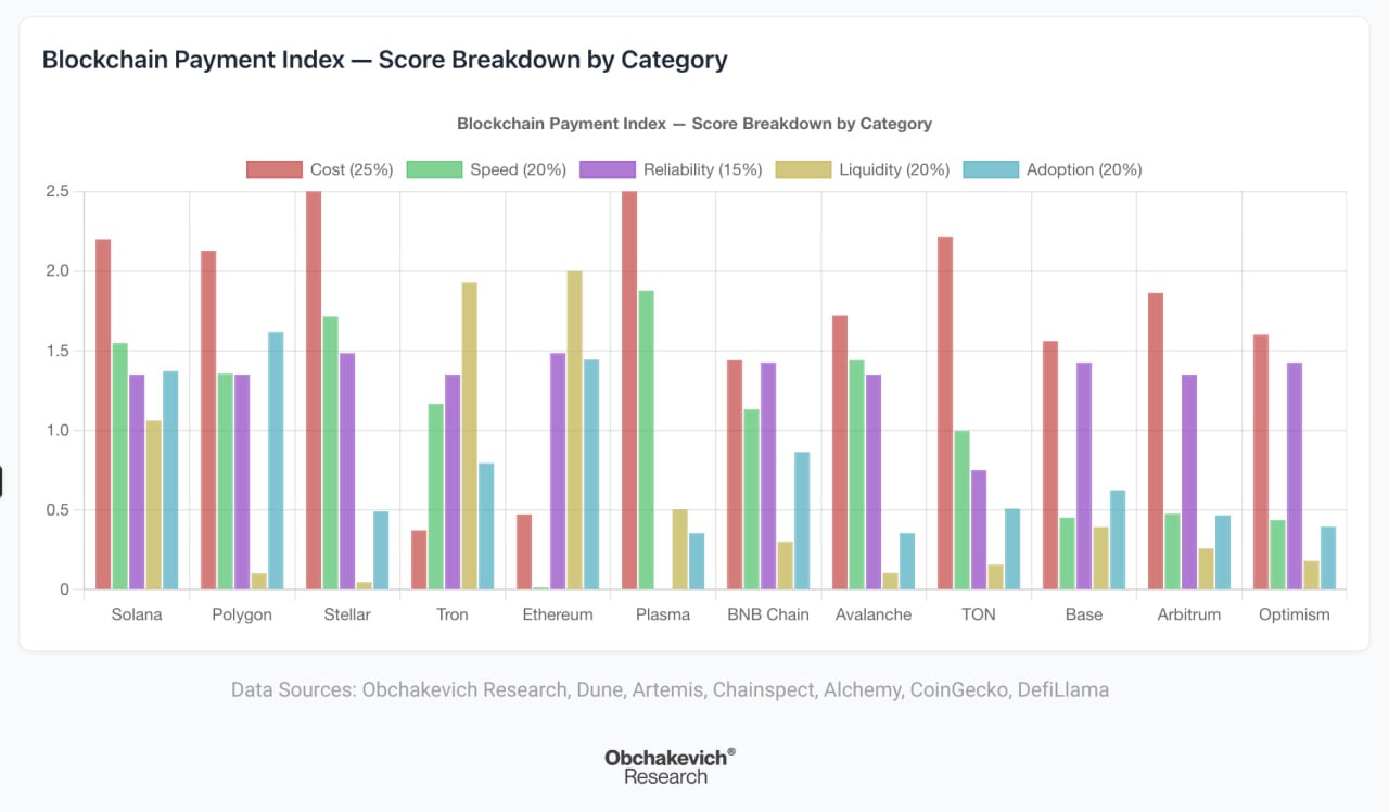 吴说获悉,据支付数据科学家 Alex,根据 P2P 转账、汇款、商户支付以及金融科技基础设施评估区块链的支付指数,其中 Solana 排名第一,相对最为均 衡,但主要弱点是稳定币的流动性落后于 Ethereum 和 Tron;Polygon 排名第二,成本、速度和可靠性表现出色,采用率最高,但最大的问题是稳定币流动 性较低;Stellar 排名第三,在跨境转账和汇款表现出色,但稳定币生态规模较低,稳定币供应量仅为 20 亿美元;Tron 排名第四,其在稳定币的交易量上占 据主导地位,特别是在大额和跨境流动中,但小额零售支付受限于费用结构;Ethereum 排名第五,持有全球稳定币供应量的 55%,但支付用户体验在底层 中存在缺陷,不适合日常支付。 (来源:吴说) 阅读原文 ...