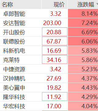 记者丨曹恩惠 编辑丨朱益民 骆一帆 2月24日马年春节过后的首个交易日里,燃气轮机概念表现活跃,联德股份、东方电气、杰瑞股份、应 流股份股价大涨,盘中均创下新高。 25日开盘,A股三大指数高开。工业机械股盘初一度冲高,柯莱特30cm涨停,德恩精工、永利股份 20cm涨停,新锦动力涨近16%,联德股份续创新高,年内已累计涨超80%。但截至发稿,板块个股涨幅 有所回落。 | 名称 | 现价 | 涨跌幅 ▼ | | --- | --- | --- | | 卓郎智能 | 3.32 | 8.14% | | 安达智能 | 203.00 | 7.24% | | 开山股份 | 20.88 | 6.69% | | 联德股份 | 67.87 | 6.06% | | 科新机电 | 16.69 | 5.83% | | 克莱特 | 34.16 | 5.86% | | 中捷资源 | 3.42 | 5.23% | | 汉钟精机 | 27.69 | 4.37% | | 美心量申 | 19.82 | 4.43% | | 隆华科技 | 11.92 | 4.29% | | 华宏科技 | 17.00 | 4.04% | 数据截至25日9:39 拥有 ...