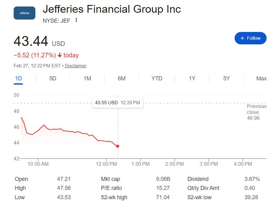 Jefferies holds $135 million exposure to collapsed UK lender MFS, Bloomberg News reports