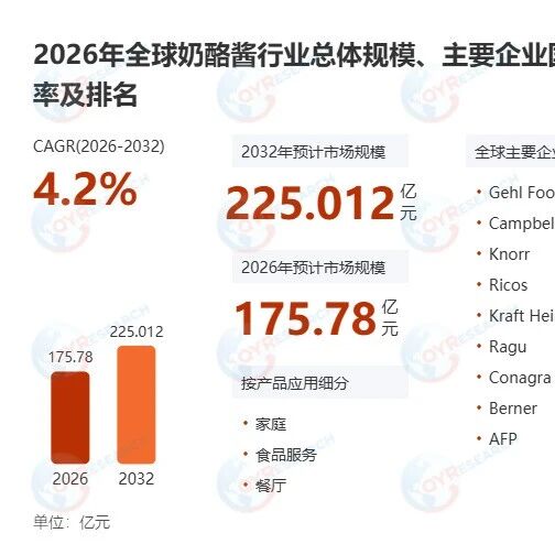 奶酪酱是英国烹饪中常用的一种传统酱汁。它以白酱(被称为 "母酱"之一)和切达奶酪为基础。奶酪酱可以 被视为英式莫尔奈酱(莫尔奈酱本身是贝夏梅尔酱的一种变体,传统上由一半格鲁耶尔奶酪和一半帕玛森奶酪 混合而成)的英式版本。制作方法是在白酱中加入适量的切达奶酪,然后用英式芥末、伍斯特沙司和胡椒等香 料调味。 根据 QYResearch 调研团队最新报告"全球奶酪酱市场报告 2026-2032 "显示,预计 2032 年全球奶酪酱市场规模 将达到 33.1 亿美元,未来几年年复合增长率 CAGR 为 4.2% 。 图. 全球奶酪酱市场前10强生产商排名及市场占有率(基于2025年调研数据;目前最新数据以本公司最新调研 数据为准) 根据 QYResearch 头部企业研究中心调研,全球范围内奶酪酱生产商主要包括 Gehl Foods 、 Kerry Group 、 AFP 、 Nestlé 、 Conagra 、 Campbell (Prego) 、 Bay Valley 、 Kraft Heinz 、 McCormick 、 Knorr 等。 2025 年,全球前五大厂商占有大约 43.0% 的市场份额。 图. 奶 ...
