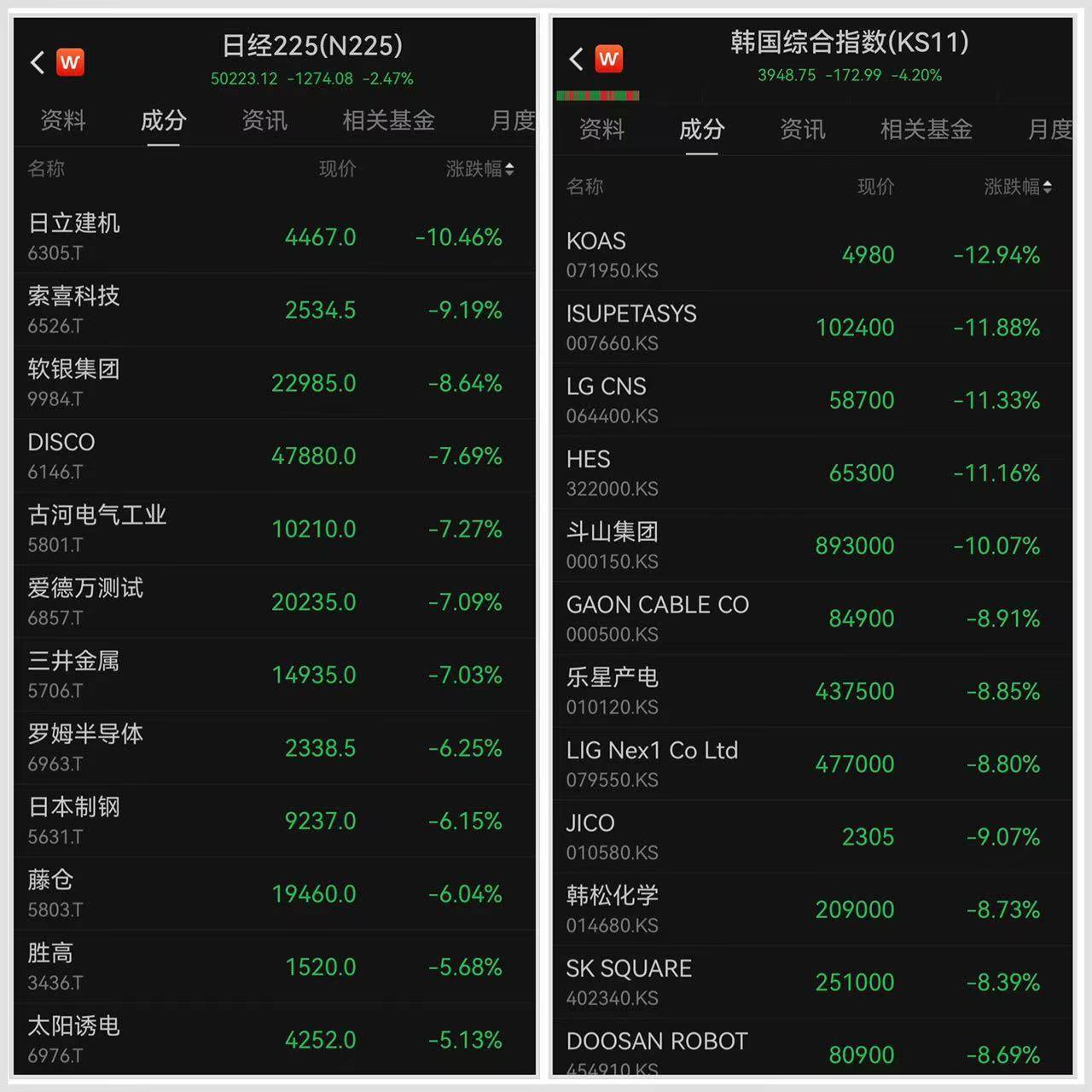 | < W | | 日经225(N225) | | | < W | 韩国综合指数(KS | | | --- | --- | --- | --- | --- | --- | --- | --- | | | | 50223.12 -1274.08 -2.47% | | | | | 3948.75 -172.99 -4.209 | | 资料 成分 | 资讯 | 相关县金 | | 月度 | 六米版 成分 | 资讯 | 相关 | | 名称 | | 现价 | 涨跌幅 ◆ | | | | | | | | | | | 名称 | | 现价 | | 日立建机 | | 4467.0 | -10.46% | | KOAS | | | | 6305.T | | | | | 071950.KS | | 4980 | | 索喜科技 | | | | | | | | | 6526.T | | 2534.5 | -9.19% | | ISUPETASYS | | | | | | | | | 007660.KS | | 102400 | | 软银集团 | | 22985.0 | -8.64% | | IG CNS | | | | 9984.T | ...