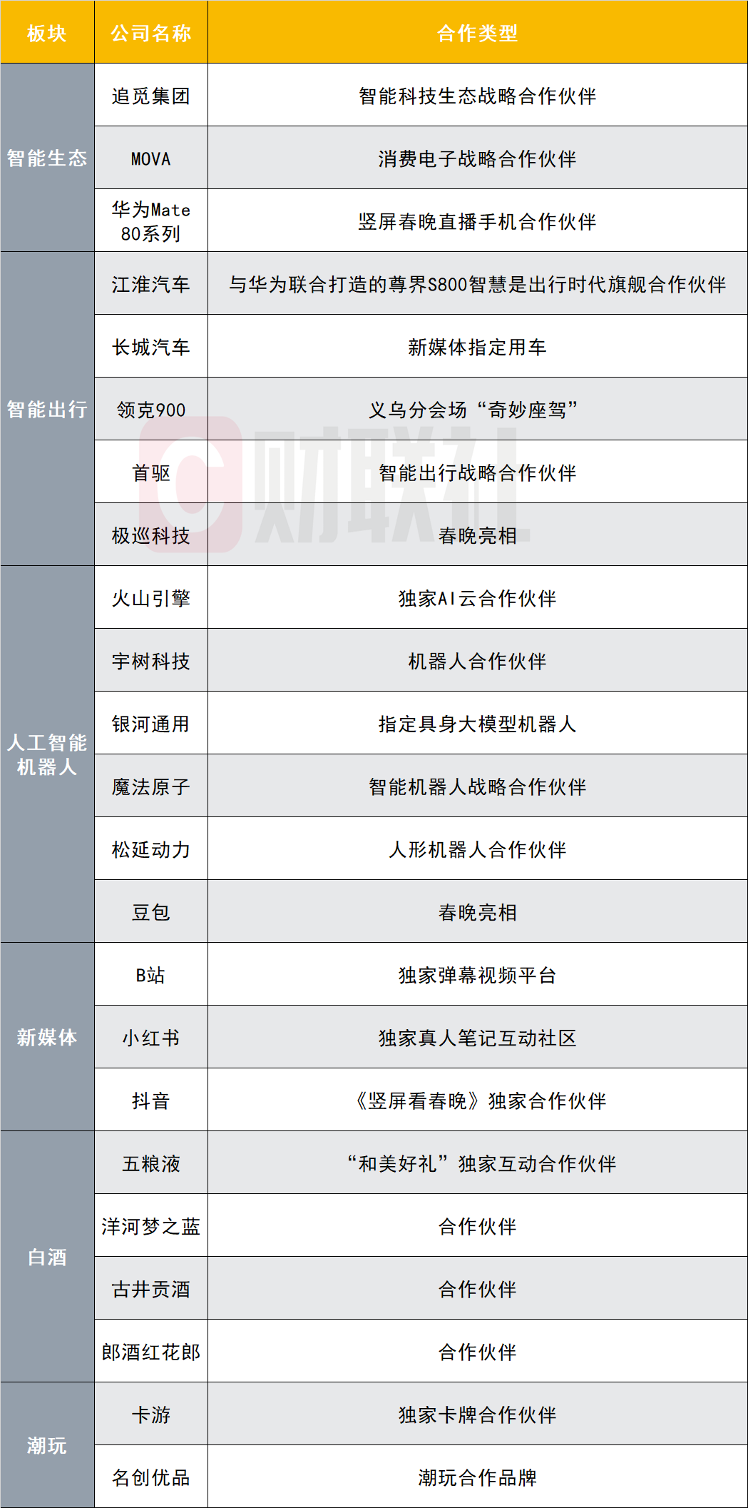 爆竹声中一岁除,春风送暖入屠苏。丙午马年新春来临之际,2026年总台春晚合作伙伴也陆续曝光。 据不完全统计,截至目前,总台春晚已官宣的合作伙伴已超20家,覆盖智能出行、人工智能机器人、白酒等多个领域。 | 板块 | 公司名称 | 合作类型 | | --- | --- | --- | | 智能生态 | 追觅集团 | 智能科技生态战略合作伙伴 | | | MOVA | 消费电子战略合作伙伴 | | | 华为Mate 80系列 | 竖屏春晚直播手机合作伙伴 | | | 江淮汽车 | 与华为联合打造的尊界S800智慧是出行时代旗舰合作伙伴 | | | 长城汽车 | 新媒体指定用车 | | 智能出行 | 领克900 | 义乌分会场"奇妙座驾" | | | 首驱 | 智能出行战略合作伙伴 | | | 极巡科技 | ■ 春晚亮相 | | 人工智能 机器人 | 火山引擎 | 独家AI云合作伙伴 | | | 宇树科技 | 机器人合作伙伴 | | | 银河通用 | 指定具身大模型机器人 | | | 魔法原子 | 智能机器人战略合作伙伴 | | | 松延动力 | 人形机器人合作伙伴 | | | 豆包 | 春晚亮相 | | | B站 ...
