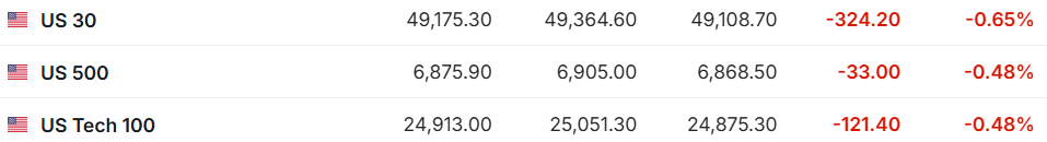 1. 2月27日(周五)美股盘前,美股三大股指期货齐跌。截至发稿,道指期货跌0.65%,标普500指数期货跌0.48%,纳指期货跌0.48%。 | ■ US 30 | 49,175.30 | 49,364.60 | 49,108.70 | -324.20 | -0.65% | | --- | --- | --- | --- | --- | --- | | ■ US 500 | 6,875.90 | 6,905.00 | 6,868.50 | -33.00 | -0.48% | | ■ US Tech 100 | 24,913.00 | 25,051.30 | 24,875.30 | -121.40 | -0.48% | 2. 截至发稿,德国DAX指数涨0.23%,英国富时100指数涨0.49%,法国CAC40指数跌0.16%,欧洲斯托克50指数跌0.05%。 | 1 德国DAX30 | 25,334.95 | 25,407.75 | 25,231.95 | +57.25 | +0.23% | | --- | --- | --- | --- | --- | --- | | 器 英国富时100 | 10,900. ...