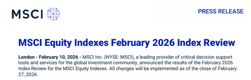 Core Viewpoint - MSCI announced its quarterly index adjustments for February 2026, which will take effect after the market closes on February 27, 2026 [1] Group 1: Index Adjustments - MSCI China A-share Index will include 33 new stocks and exclude 9 stocks [1] - Inclusion in the MSCI China Index means entry into the MSCI Global Standard Index series, leading to significant passive fund tracking [1]