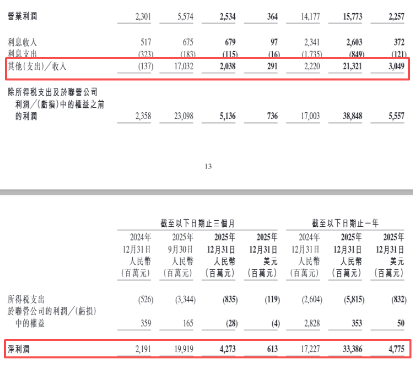 财报显示,2025年,携程的其他收入为213.21亿元,占总营收超六成;而上年同期该项仅为22.20亿元,同比大增近10倍。 对于净利润大增的原因,携程表示,2025年归属于公司股东的净利润同比增加主要由于全年包含在其他(支出)╱收入中的投资利得199亿元,2024年为 11亿元。 【导读】携程公布2025年业绩,同日官宣两位联合创始人辞职 2月26日,携程集团(以下简称携程)公布2025年第四季度及全年未经审计的财务业绩。 财报显示,2025年,携程净营业收入为624.09亿元,同比上升17.10%;归属于公司股东的净利润为332.94亿元,同比增长95.08%。同日,携程宣布,联合 创始人范敏、季琦辞去董事及管理职务。 财报发布后,携程港股股价下挫,盘中一度跌超4%。截至收盘,携程跌3.24%,最新市值为2857亿港元。 超六成收益来自其他收入 从业绩来看,携程的增长势头十分强劲,但利润暴增的背后,是其他收入这一类目的跳涨。 发布财报当日,携程同步公布了一系列董事变动,变动自2026年2月25日起生效。 | 營業利潤 | 2.301 | 5.574 | 2,534 | 364 | 14.177 | 15, ...