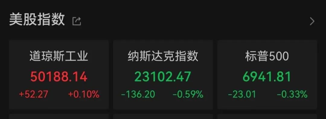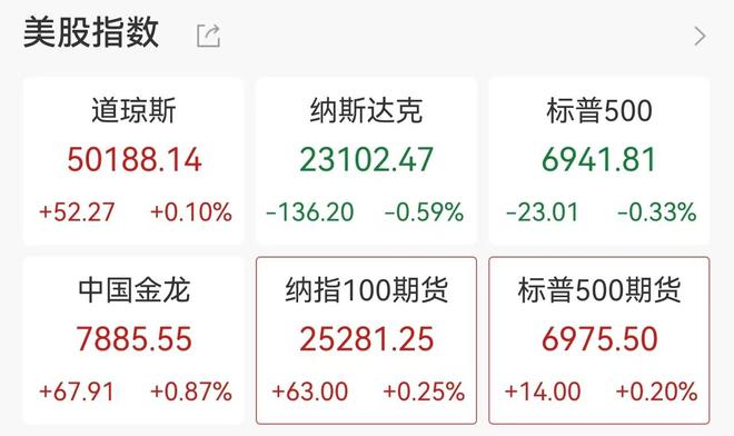 市场普遍估算,亚马逊、Alphabet、Meta和微软在AI上的整体投资规划规模约为6500亿美元。"此前市 场将巨额资本开支视为增长确定性,而现在叙事出现明显转变,相关支出变成了对投资回报的焦 虑。"东吴证券研判,"美股市场正处于'双重压力'共振期,预计持续处于高波动状态。" 美东时间2月10日,美股市场呈现显著分化格局。道琼斯工业平均指数在零售股与金融股轮动支撑下微 涨0.1%,以50,188.14点续创收盘历史新高,盘中更一度触及50,512.79点,实现连续第三个交易日刷新 纪录。而标普500指数与纳斯达克综合指数则分别下跌0.33%和0.59%,科技股集体回调与疲软经济数据 成为主要拖累。 | 美股指数 [4 | | | | --- | --- | --- | | 道琼斯 | 纳斯达克 | 标普500 | | 50188.14 | 23102.47 | 6941.81 | | +52.27 +0.10% -136.20 -0.59% | | -23.01 -0.33% | | 中国余龙 | 纳指100期货 | 标普500期货 | | 7885.55 | 25281.25 | 6975.50 | | ...