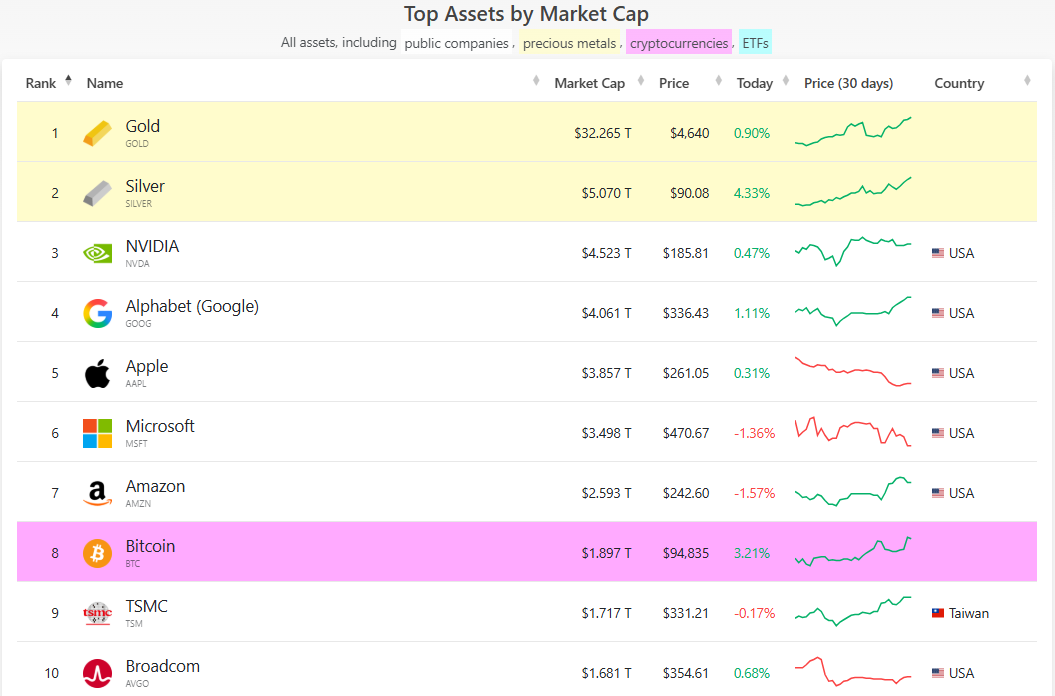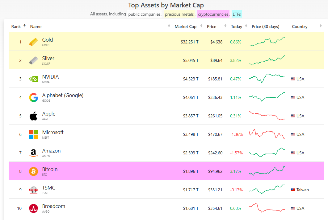 国际银价首次站上90美元,市值突破5万亿美元,超英伟达成全球第二大资产!黄金32万亿美元市值位居榜首!