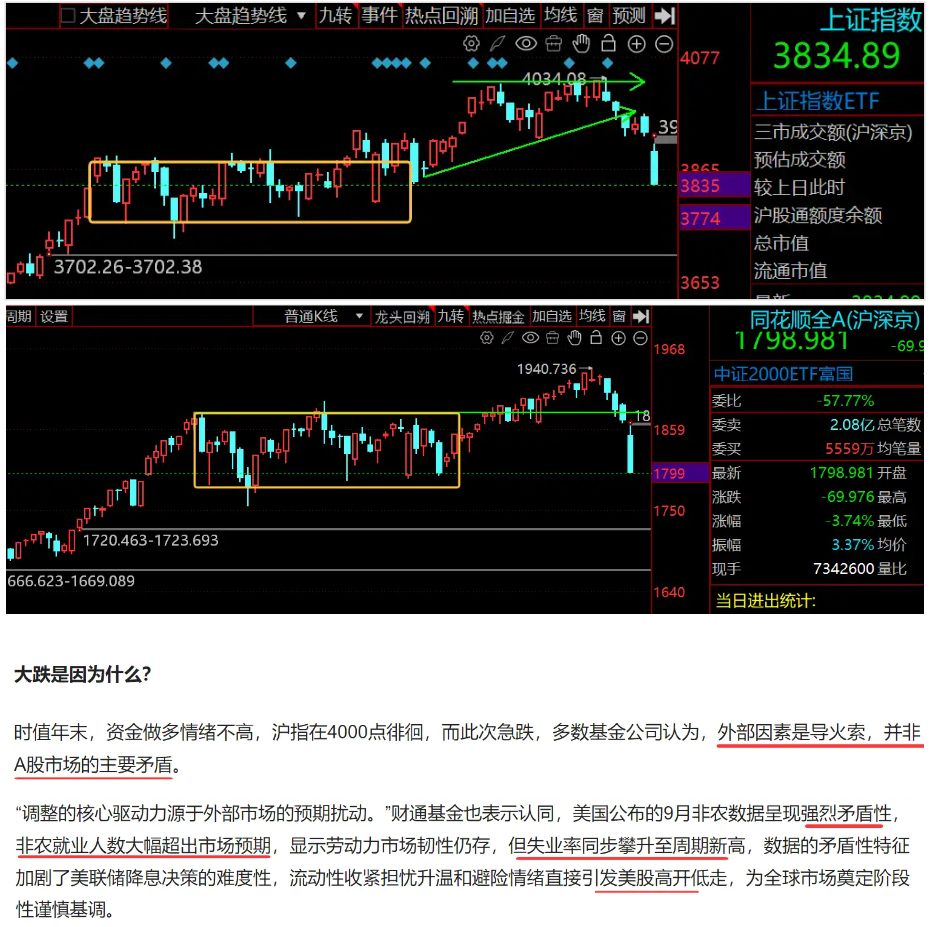大跌是因为什么? 时值年末,资金做多情绪不高,沪指在4000点徘徊,而此次急跌,多数基金公司认为,外部因素是导火索,并非 A股市场的主要矛盾。 "调整的核心驱动力源于外部市场的预期扰动。"财通基金也表示认同,美国公布的9月非农数据呈现强烈矛盾性, 非农就业人数大幅超出市场预期,显示劳动力市场韧性仍存,但失业率同步攀升至周期新高,数据的矛盾性特征 加剧了美联储降息决策的难度性,流动性收紧担忧升温和避险情绪直接引发美股高开低走,为全球市场奠定阶段 性谨慎基调。 下, 766亿资金借ETF"越跌越买",基金公司火 A股资金动向 2025-11-23 11:35 星期日 财联社记者 闫军 热点回溯 加自选 均 大营超型在 大营档型线 | 71.45 34.80 证指数ETF 30 市成交额(沪深京) 预估成交额 较上日此时 沪股通额度余额 总市值 12.26-3702.38 流通市值 3653 哥期 设置 普通K线 ▼ 尤其同湖 刀 2.08亿总管费 1859 559万 均管是 8.981 开盘 69.976 最高 1750 3.74%最低 3.37%均价 7342600 量比 666.623-1669.089 16 ...