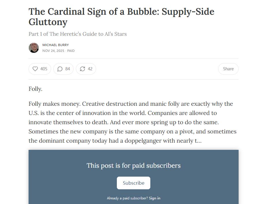 "这一次没有什么不同,无论多少人试图证明。再一次,有一个思科处于这一切的中心,它为所有人提供'镐和铲子',并伴随着宏大的愿 景。它的名字叫英伟达。" 在经历了基金注销传闻与"做空AI金额被媒体夸大百倍"的闹剧后,电影《大空头》原型、知名投资者Michael Burry于当地时间11月24日兑 现承诺,准时"回归"。 这一次,他并未如传言般通过巨额期权做空市场,而是选择通过首篇专栏文章《泡沫的主要迹象:供给侧的暴食》(The Cardinal Sign of a Bubble: Supply-Side Gluttony)来表达"做空AI"的观点。 Burry在这篇文章中,正式向当下的AI热潮宣战,而风暴的中心正是英伟达。他直指英伟达即是当年的思科。 核心论战:英伟达就是当年的思科 针对近期市场认为"科技巨头盈利能力强,因此不存在泡沫"的主流观点,Burry在文中进行了针锋相对的反驳。 他列举了1999年互联网泡沫巅峰时期的数据指出,当年的繁荣同样是由高利润公司推动的,而非仅仅是那些甚至没有收入的小网站。 "并不像人们以为的那样是由无利可图的网络公司驱动,1999年强劲的纳斯达克指数是由当时高利润的大盘股推动进入 ...