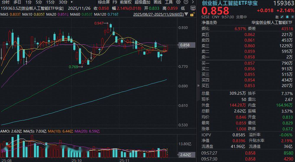 | 分时 多日 1分 5分 15分 30分 7 | 综合屏 F9 前复权 超级叠加 回线 工具 (2) | 159363 | 创业板人工智能印文字 | 159363.SZ[创业板人工智能ETF华宝] 2025/11/26 收 0.858 幅 2.14%(0.018) 开 0.833 高 0.859 低 | 0-8 | OHE | +0.018 +2.14% | | --- | --- | --- | --- | --- | --- | --- | --- | | 10 10 | MA5 0.8331 MA10 0.8351 MA20 0.851 MA60 0.8537 MA120 0.7167 | 2025/08/27-2025/11/26(60日) | SZSE CNY 9:57:30 交易中 | 十八 六 · | | | | | 净值走势 | 华宝创业板人工智能ETF | 0.930 | 製化 | 6.97% === | 43516 | | | | 菜五 | 0.862 | 221万 | 題 要要要要是 | 0.861 | 453万 | | | | 0.858 | 0.860 | 1229万 | 0.85 ...