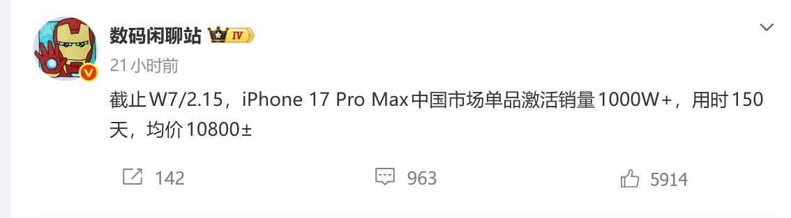 这一数字也可与另一位博主@RD 观测 公布的数据互相印证。 该博主本月发布的数据显示,2025年全年,苹果在中国市场售出的手机中,价位段超过8000元的产品占比为54.4%。另一方面,截至2026年2月8日,iPhone 17系列在中国的销量高达2093.27万。如果按照50%的占比来估算的话,也与iPhone 17 Pro Max单品销量突破1000万台的爆料基本吻合。 2月24日,数码博主@数码闲聊站 爆料称,截至2026年2月15日,iPhone 17 Pro Max在中国市场的单品激活销量已超1000万台,均价在10800元左右,解锁千 万销量用时约150天。 此前,Counterpoint Research最新数据显示,2026年1月中国智能手机市场整体销量同比下滑23%,苹果成为唯一实现正向增长的品牌。 该机构分析认为,在整体销量同比下降23%的大环境下,华为、小米、OPPO、vivo等国产厂商均出现下滑,主要受到补贴减少、消费情绪以及即将到来的 春节的影响。然而,iPhone 17系列助推苹果逆势实现了8%的增长,并将其市场份额提升至约20%,与华为并列市场领先地位。 该机构研究人员表示,iPh ...