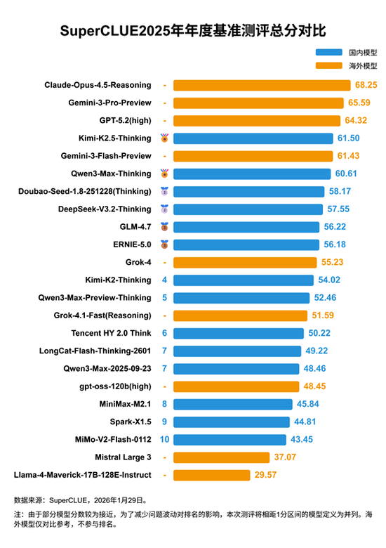 炒股就看金麒麟分析师研报,权威,专业,及时,全面,助您挖掘潜力主题机会! 来源:人工智能顾问 日前,国内权威大模型评测机构SuperCLUE正式发布《2025年年度中文大模型基准测评报告》。这份被 誉为"AI界年终成绩单"的重磅榜单,再次点燃了行业关注。 这标志着国产大模型正从"追赶者"迈向"并行者",甚至在特定领域实现"领跑"。 01 海外闭源模型领跑,国产模型紧咬不放 本次测评从数学推理、科学理解、代码生成等六大核心维度,全面检验大模型的综合智能水平。最终综 合得分排名中: ●第1名:Claude-Opus-4.5-Reasoning(Anthropic)—68.25分 ●第2名:Gemini-3-Pro-Preview(谷歌)—65.59分 ●第3名:GPT-5.2(high)(OpenAI)—64.32分 三大海外闭源模型凭借其强大的工程优化与数据积累,继续领跑全球。 但值得注意的是,第4名由国产开源模型Kimi-K2.5-Thinking以61.50分强势拿下,成为综合排名最高的 国产模型;而阿里云推出的高性能模型Qwen3-Max-Thinking则以60.61分位列第6,紧随其后,展现出中 国头 ...