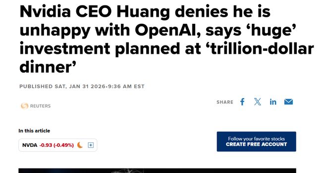 这项合作一度被视为双赢:英伟达能向 OpenAI 出售大量顶级 AI 芯片,进一步扩大数据中心业务版图;OpenAI 则能获得扩张 AI 基础设施所需的资金支 持。 最新情况显示,合作正在遇到阻力。上周五,《华尔街日报》报道称,英伟达内部有人开始质疑交易,两家公司的谈判并未走出初期阶段。报道称,双方正 在重新评估合作前景,最新讨论可能涉及在 OpenAI 当前融资轮中进行规模达数百亿美元的股权投资。 报道还提到,黄仁勋曾批评 OpenAI 的商业策略"缺乏纪律",并对 OpenAI 在与谷歌、Anthropic 竞争中的处境表示担忧。 IT之家 2 月 2 日消息,当地时间 2 月 1 日,据彭博社报道,英伟达 CEO 黄仁勋明确表态,公司并没有必须投资 OpenAI 的责任,而是更愿意"走一步看一 步",逐步投入。 此前,OpenAI 曾暗示英伟达可能最高投资 1000 亿美元(IT之家注:现汇率约合 6965.73 亿元人民币),黄仁勋对此表态称,这个数字从来不是正式承诺, 更不意味着英伟达会一次性砸下 1000 亿美元。"OpenAI 确实邀请我们最多可以投到 1000 亿美元,我们很高兴也很荣幸,但投 ...
