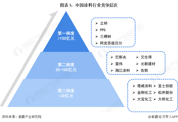 本文核心数据:涂料企业竞争格局;涂料市场集中度 1、中国涂料行业竞争梯队 根据国内涂料行业首家财经媒体《涂界》发布的《2025中国涂料企业100强排行榜》对中国涂料行业竞争梯 队进行分析,销售额大于100亿元的企业有立邦、PPG、三棵树和阿克苏诺贝尔等,位于行业竞争第一梯 队;30-100亿元区间内包括巴斯夫、佐敦、宣伟、艾仕得、北新建材、湘江涂料等,位于第二梯队;小于30亿 元企业包括德威涂料、亚士创能、松井股份、大宝化工、大桥化工等,位于第三梯队。 转自:前瞻产业研究院 以下数据及分析来自于前瞻产业研究院涂料研究小组发布的《中国涂料行业发展前景预测与投资战略规划分 析报告》 行业主要上市公司:三棵树(603737)、北新建材(000786)、亚士创能(603378)、松井股份(688157)等 2、中国涂料行业区域竞争分析 根据企查猫以"涂料、油墨、颜料及类似产品制造业"为选定行业,以"涂料"为关键词进行精确搜索,涂料产 业链企业主要分布在广东省,以及山东、浙江、江苏、上海等华东地区。截至2025年12月,广东共有相关涂 料企业数5931家。 注:企查猫数据截止到2025年12月5日 从代表性企业分布来看 ...