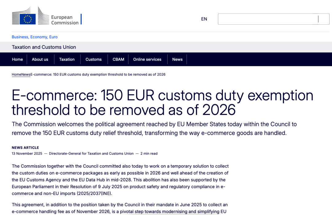 作者|骑鲸出海 周松 马年春节的年味还没散尽,欧盟已经给中国跨境电商卖家送来了一份"大红包"。 只不过,这个红包拆开一看,是关税。 近日,欧盟委员会税务与海关联盟总司正式公布跨境电商进口监管改革方案:自2026年7月1日起,欧盟将废除沿用数十年的150欧元以下小额包裹关税豁 免政策,改为对每一件进口商品统一征收3欧元关税。 图源:欧盟官网 现实数据足够刺眼:仅在2024年,进入欧盟的低价小包裹就高达46亿件,其中91%来自中国。 问题也因此不再只是"成本上升多少",而是更残酷的拷问: 当免税红利彻底终结,欧洲这块全球最大的跨境电商消费市场,还能容纳多少依赖低价生存的中小卖家?而欧洲电商的游戏规则,又将被改写成什么样 子? 两年"缓冲期" 说起来,欧盟的小包裹免税政策,并不是为中国跨境电商量身定制的。 它最早可以追溯至1983年,并在1991年和2008年做出两次调整,逐步提升免征关税包裹的价值额度。与此同时,欧盟对低于22欧元进口包裹的增值税实行 了长期豁免,便利了小额包裹跨境流通。 按照规划,"3欧元"固定关税只是过渡方案,将从2026年7月1日持续至2028年7月1日,必要时可延长。过渡期结束后,150欧 ...